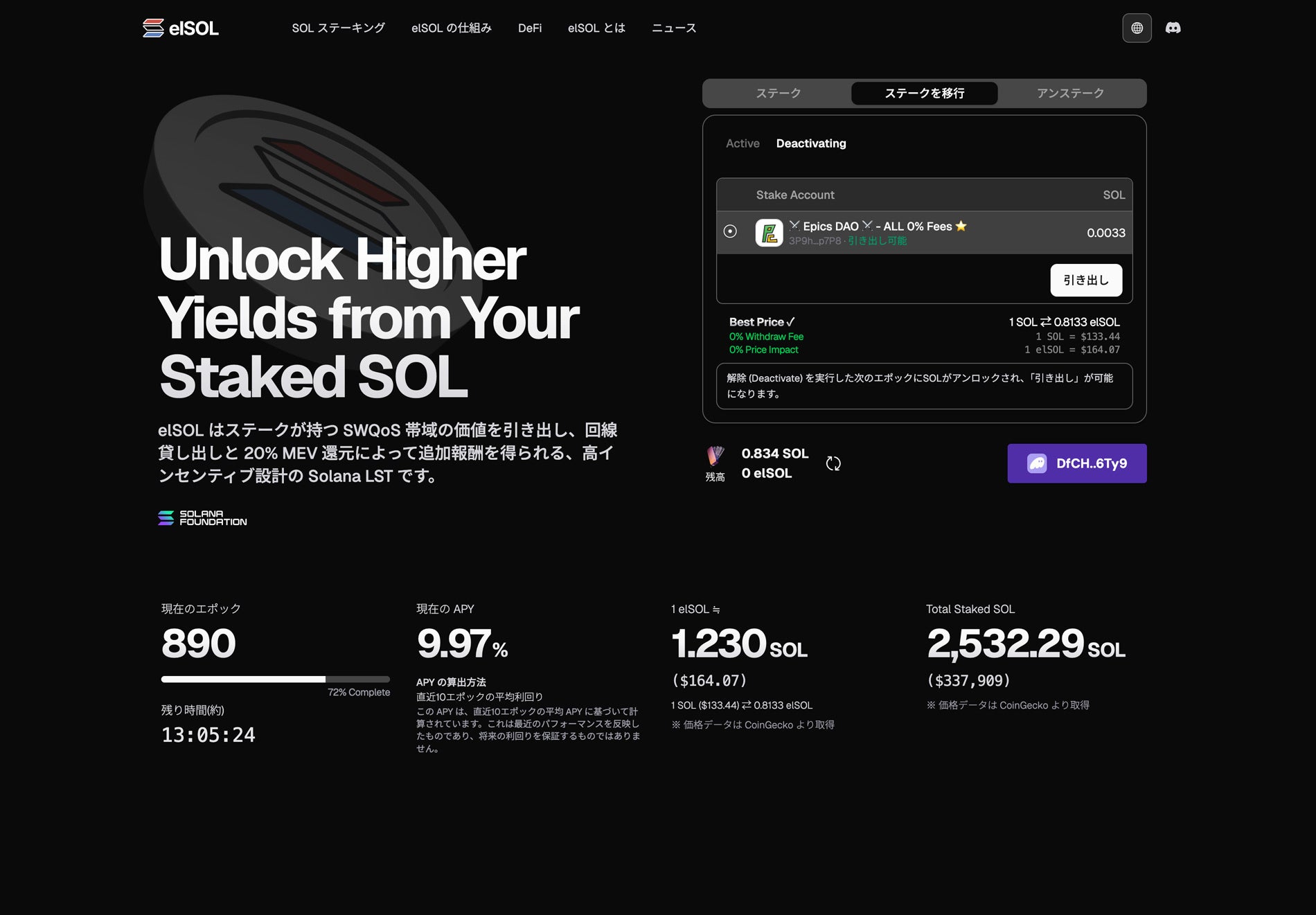 今回の更新では、これまで採用していた Dialect Blinks ベースのステーキングコンポーネントを見直し、ステーキングUIを独自実装として再構築しています。これにより、フォーム入力の補助を強化し、動作の高速化と安定性の向上を行いました。ステーキングからアンステーキング、ステークアカウントの移行、解除(Deactivate)、SOL引き出し(Withdraw)まで、elSOL アプリケーション上のUIで簡潔に操作できるようになっています。