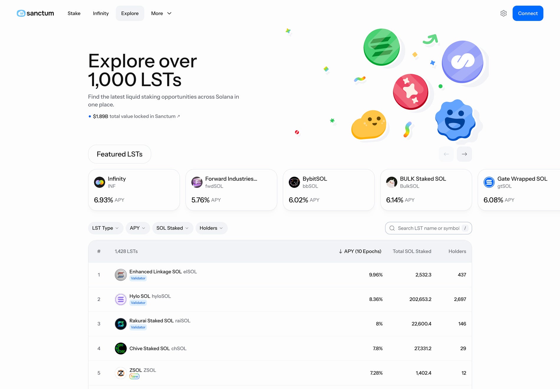 Sanctum は、Solana 上の LST を横断的に一覧化し、APY、総ステーク量、ホルダー数などを比較できるダッシュボードです。Explore では 1,000 を超える LST が掲載されており、キャプチャ時点では 1,428 LSTs が表示されています。