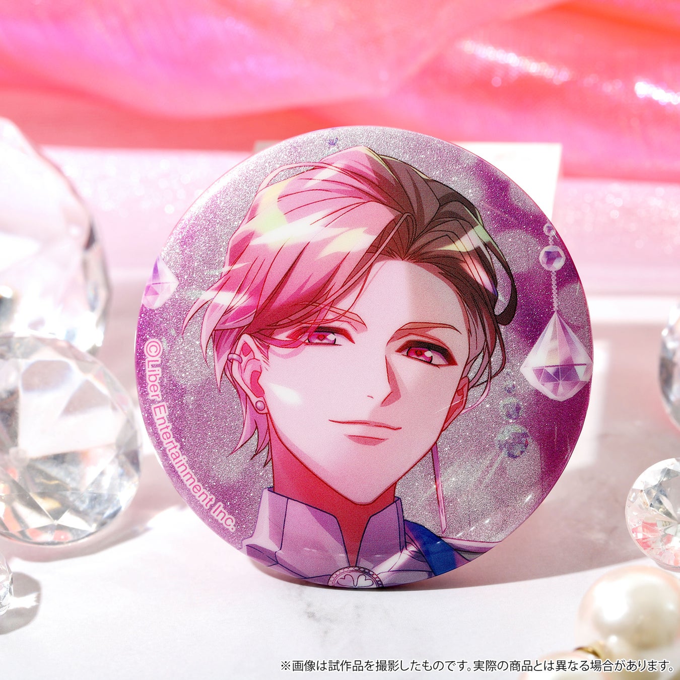 缶バッジは背景がキラキラと輝くグリッター仕様、オーロラアートは角度によってなめらかに輝く華やかなアイテム。