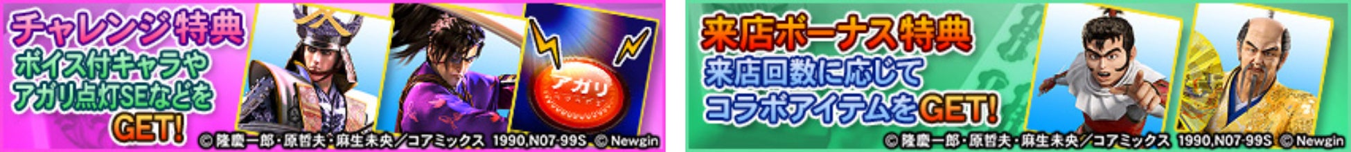 進化型SPキャラ(SSR)「前田慶次4」「奥村助右衛門2」など『e花の慶次~黄金の一撃』をはじめとする『花の慶次』シリーズをイメージしたキャラクター、アガリ演出、卓背景、EX枠、EX背景、BGMなどコラボアイテム全60種が期間限定で登場します。