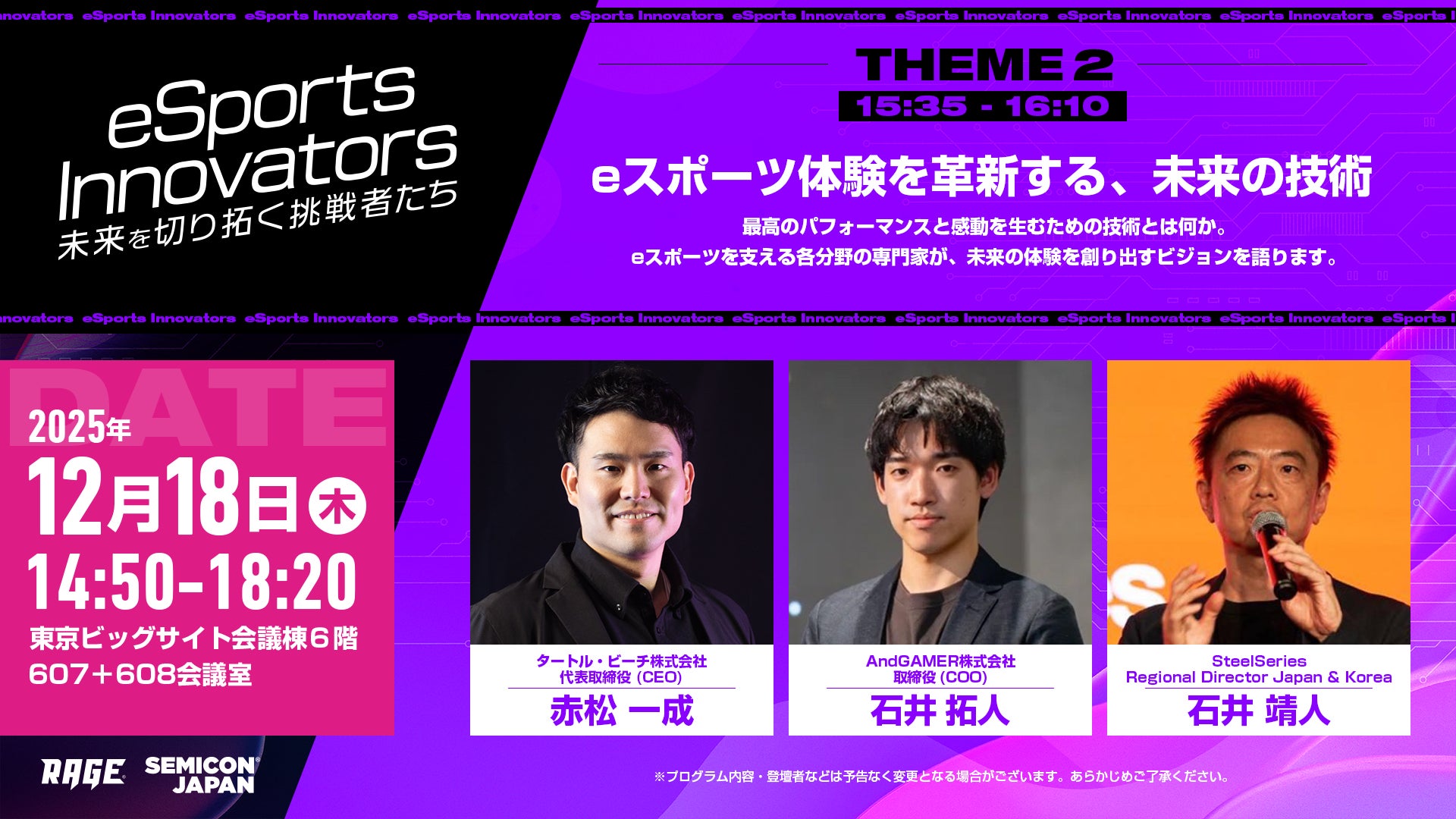 国内最大級のeスポーツイベント「RAGE(レイジ)」は、2025年12月18日(木)に東京ビッグサイトで開催される「SEMICON Japan 2025」特別企画「eSports Innovators ~未来を切り拓く挑戦者たち~」(主催:SEMI)に運営協力として参画いたします。