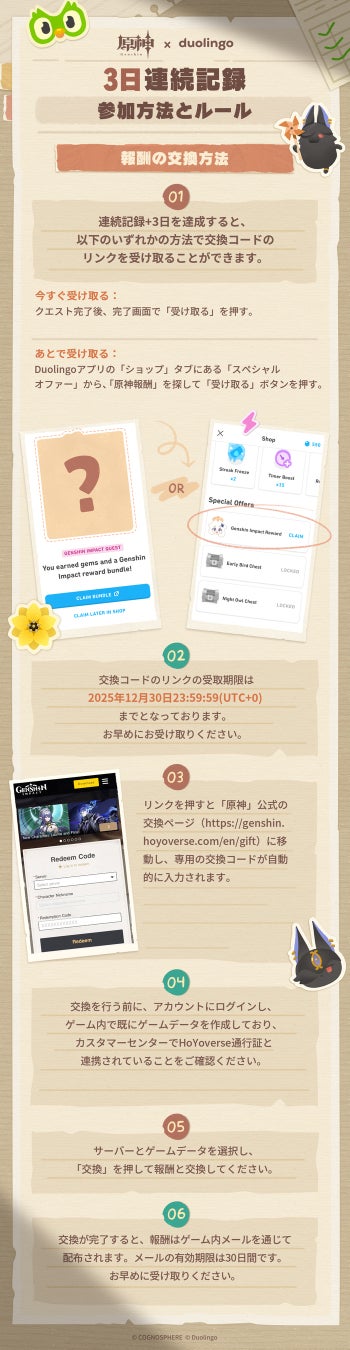 クエストを達成すると、『原神』特別報酬としてアイコン「勤勉」、名刺「祭典・夢習い」、そしてスメール風の特別料理「スパイシーサクサクチキン」とそのレシピが贈られます。報酬の交換コードの受取期限は2025年12月30日23:59:59(UTC)までとなり、Duolingoの「ショップ」にて受け取ることができます。交換コード受取後、『原神』での交換期限は2026年1月31日15:59:59(UTC)までとなります。