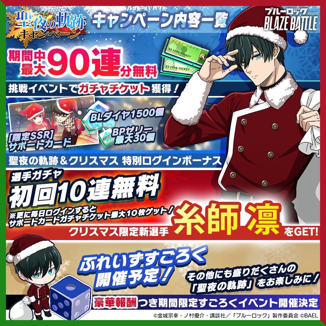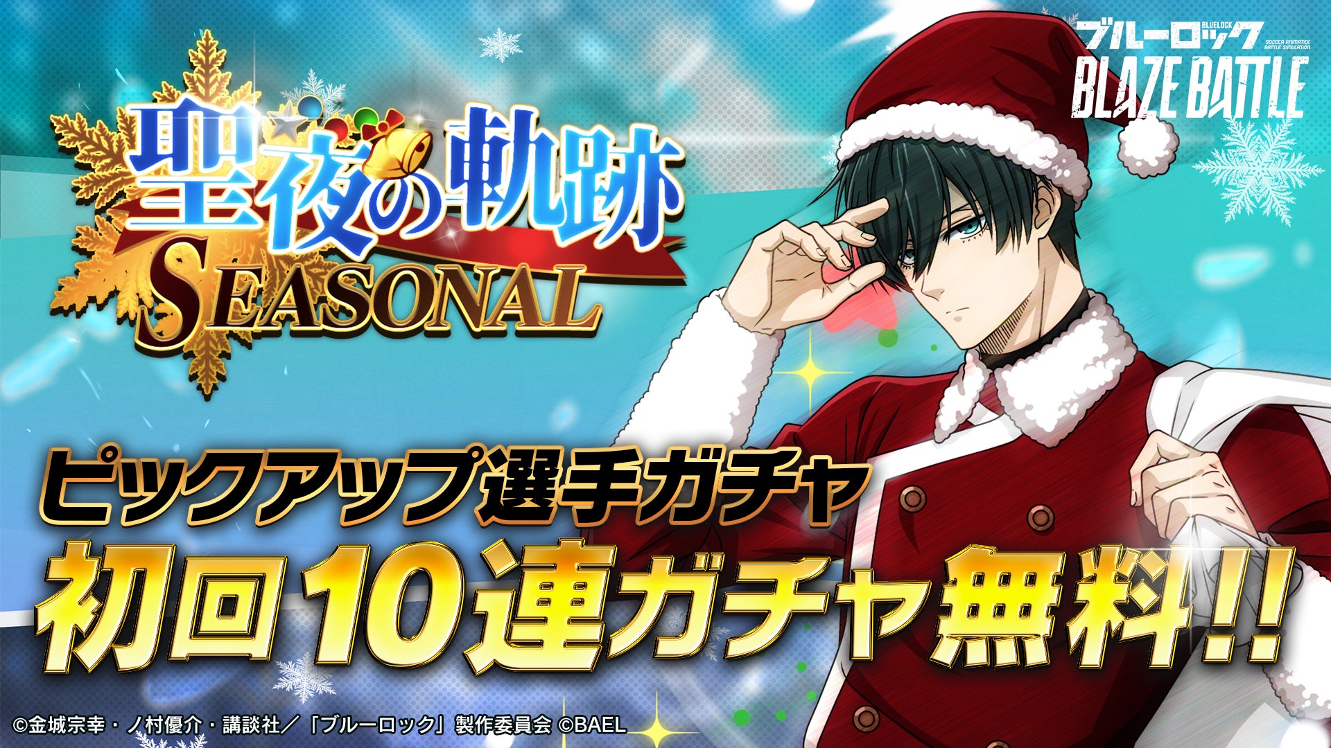 株式会社BAEL(本社:東京都新宿区、代表取締役:田村友一)は、TVアニメ『ブルーロック』を原作とするスマホゲーム『ブルーロック BLAZE BATTLE』(以下、ブレバト)にて、クリスマスをモチーフにしたサンタクロース姿の【糸師 凛】が新登場し、これに合わせて最大90連分の無料ガチャなど、豪華報酬が手に入る「聖夜の軌跡キャンペーン」を開催いたします。