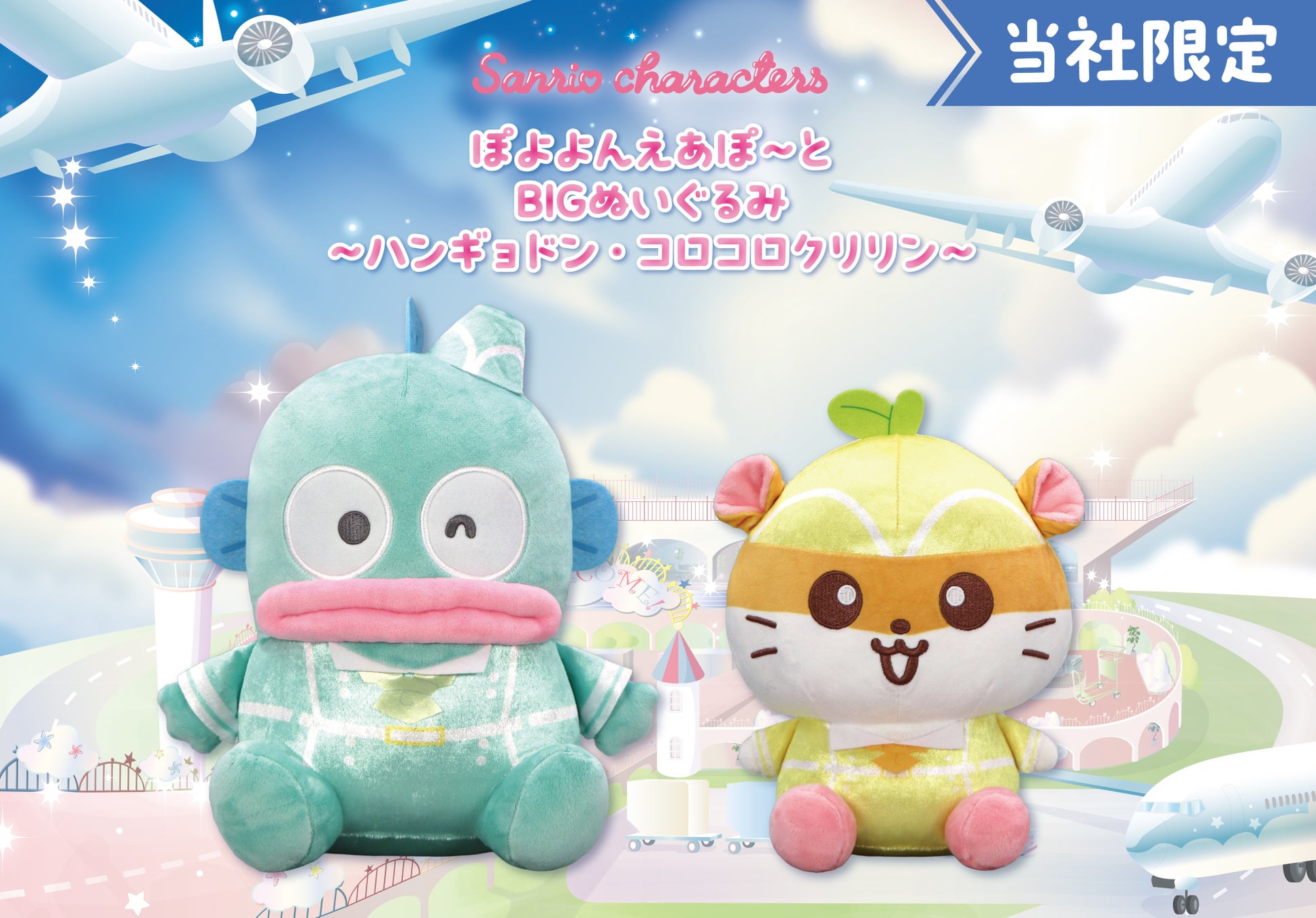 全24種のサンリオキャラクターズのプライズ「サンリオキャラクターズ ぽよよんえあぽ~と」が、空港をテーマにしたオリジナルデザイン全24種類の「BIGぬいぐるみ」になって毎月登場予定です。第一弾~第七弾では、「シナモロール」と「ウサハナ」、「けろけろけろっぴ」と「マロンクリーム」、「リトルツインスターズ」、「ポチャッコ」と「がおぱわるぅ」、「ポムポムプリン」とチームプリン、「あひるのペックル」、「こぎみゅん」、「クロミ」、「バッドばつ丸」が登場し、今回の第八弾では「ハンギョドン」、「コロコロクリリン」が登場いたします。