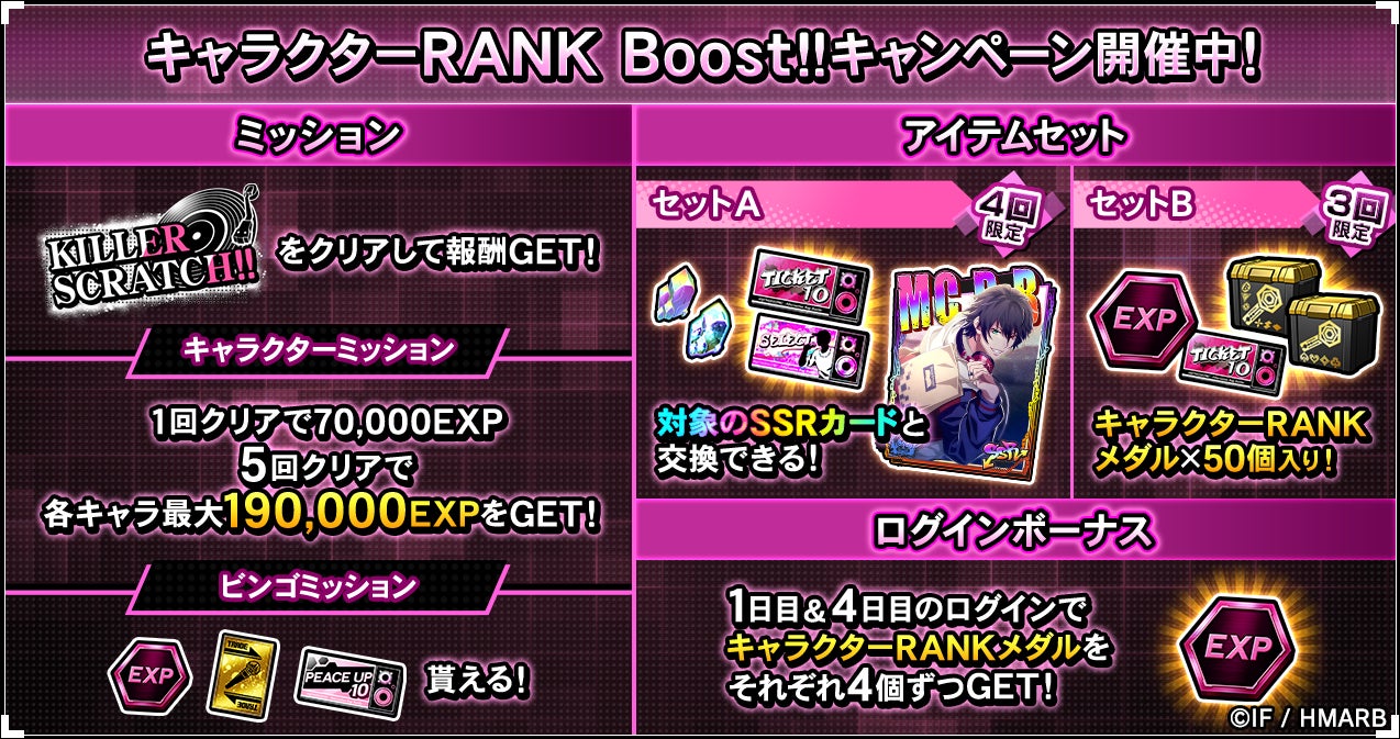 期間中、キャラクターRANK EXPを各キャラクター最大190,000獲得できるキャラクターミッションをはじめ、ビンゴミッションやログインボーナスを開催しています。ログインボーナスでは、選んだキャラクターのRANK EXPがたまる「キャラクターRANKメダル」を獲得することができます。また、「SSR【Extra Wardrobe 02】」シリーズのカードが上限解放され、キャラクターRANKを上げることで最大6枚まで獲得できるようになりました。詳細はアプリ内お知らせをご確認ください。