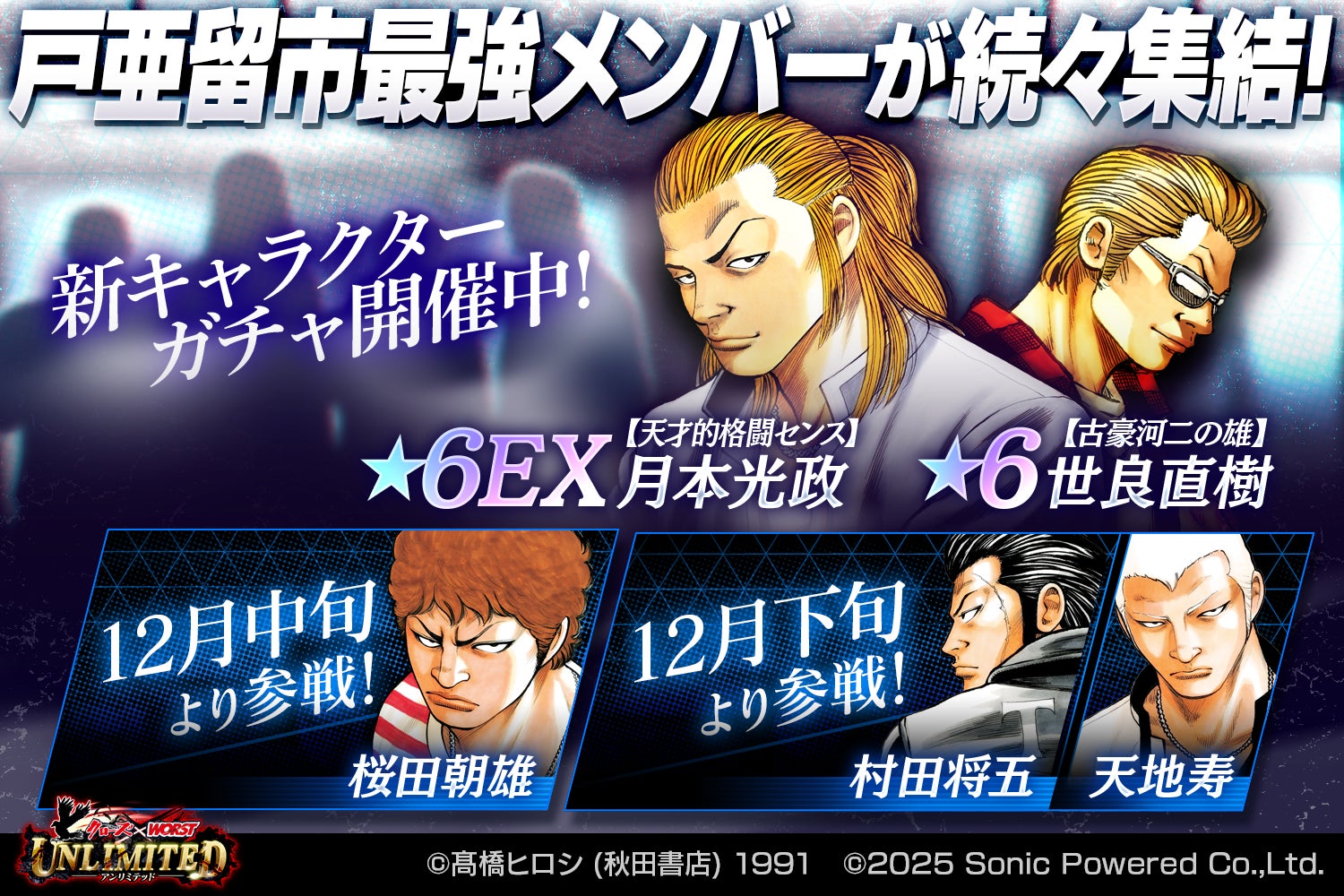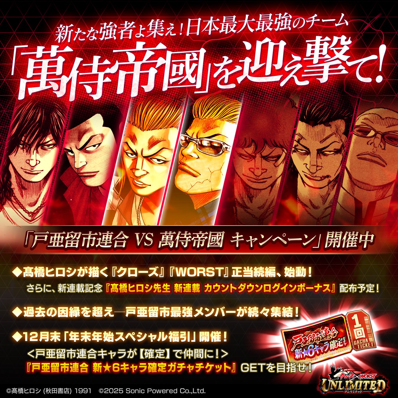 さらに、『クローズ』『WORST』を題材とした、スマホ向けゲーム『クローズ×WORST UNLIMITED』(略称「アンリミ」) では12月9日(火)より <戸亜留市連合 VS 萬侍帝國キャンペーン>開催!