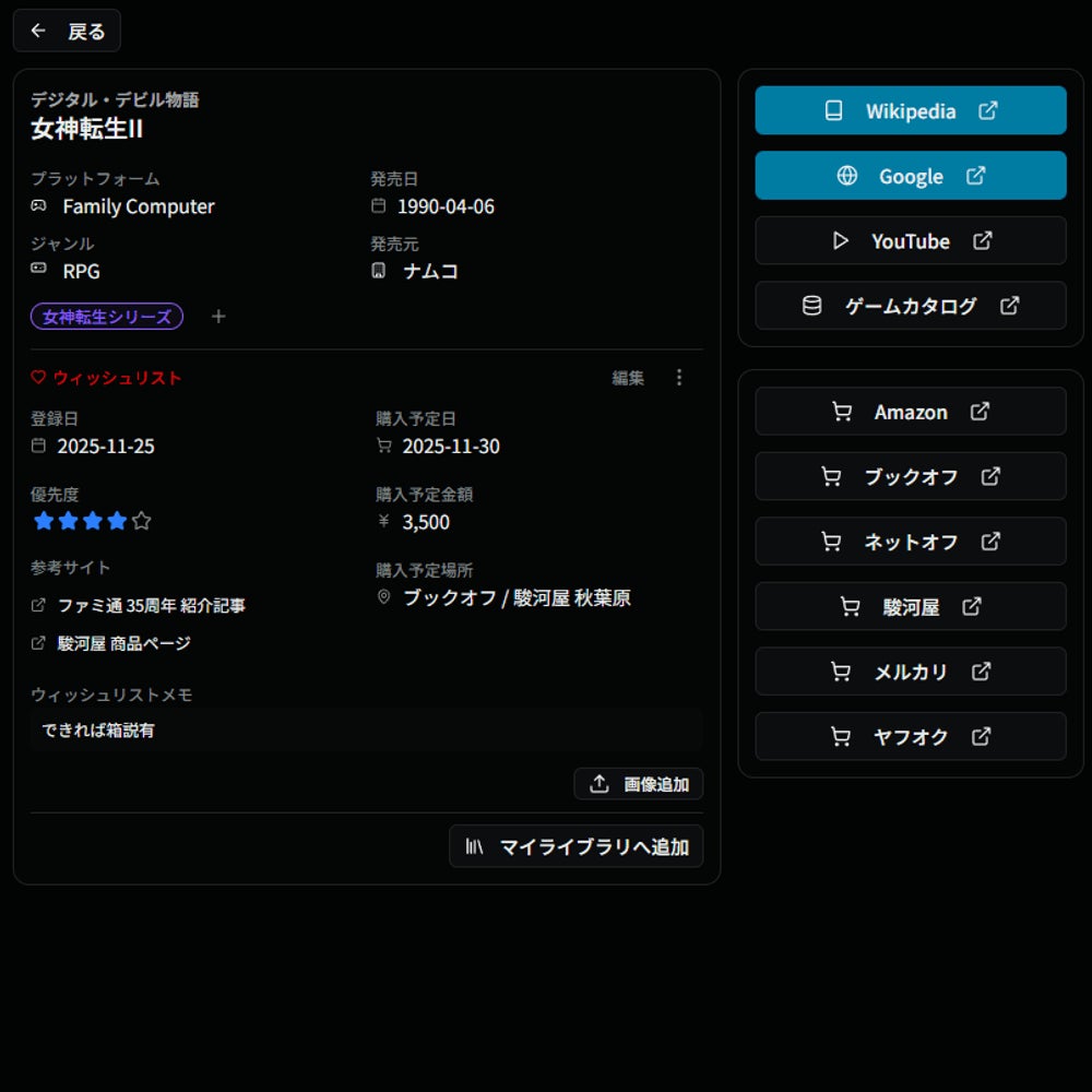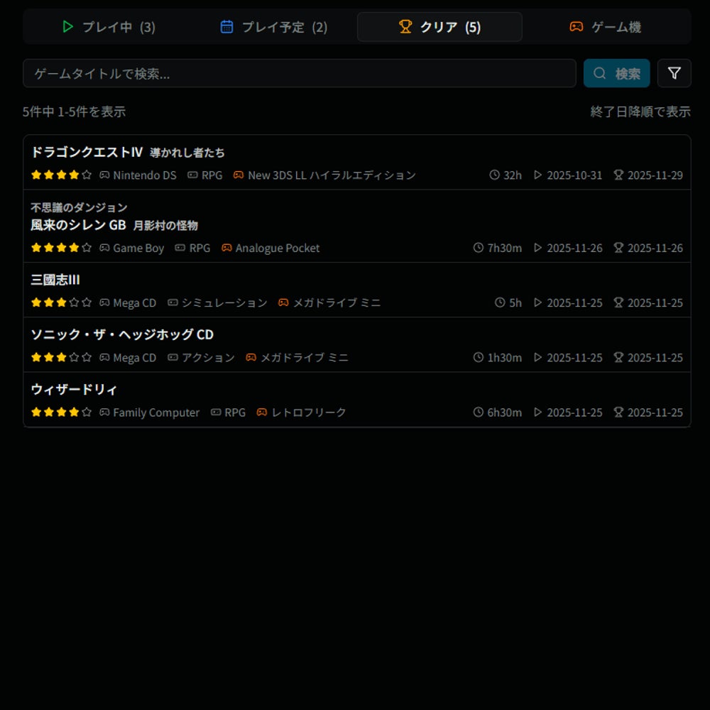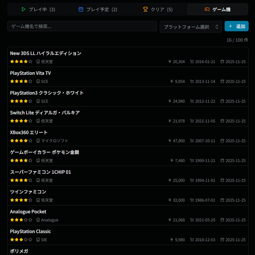 「実機で遊んだか、互換機で遊んだか」といったこだわりの記録を残せます。 また、データベースにない最新プラットフォームゲームやインディーゲームも「カスタムゲーム」として登録可能なため、あらゆるコレクションを網羅できます。
