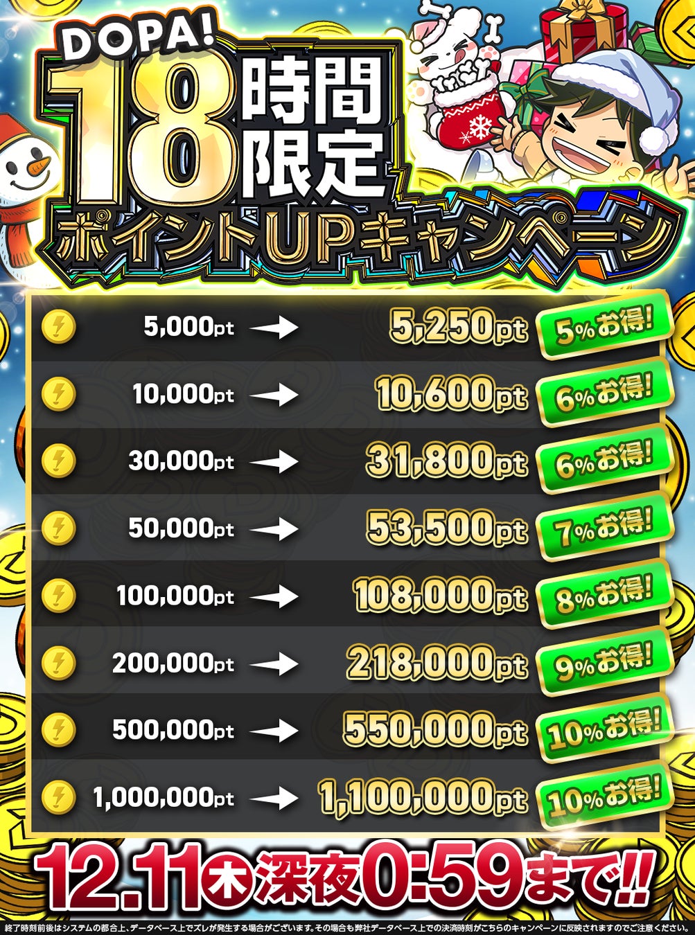 ポイントアップキャンペーンでは、期間中にポイントを購入すると、金額に応じてボーナスポイントが自動で付与されます。対象期間であれば、何度購入してもポイントアップが適用されるため、お得にDOPA(ドーパ)を楽しめます。