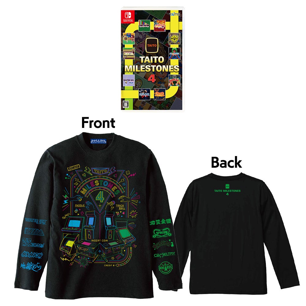 『タイトーマイルストーン4』に加え、ゲームをモチーフにしたアパレルグッズを展開する「EDITMODE」による本作オリジナルデザインのロングTシャツを加えたセット商品『タイトーマイルストーン4』ファミ通DXパックも本日より予約開始します。