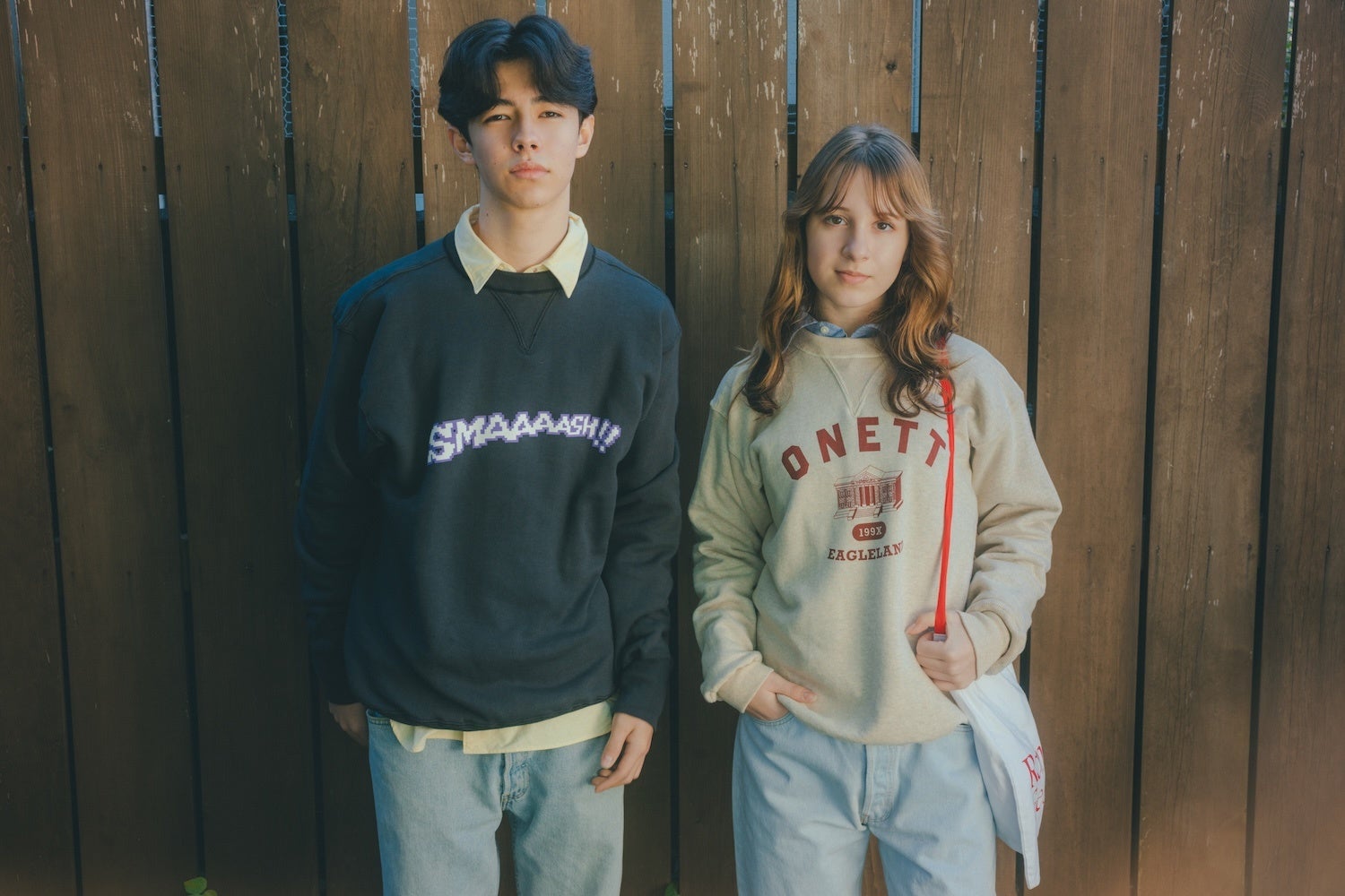 アメリカンヴィンテージウェアの忠実な復刻を追求するブランド、ウエアハウスとコラボ。ボディは1930年代のヴィンテージスウェットシャツを忠実に復刻しました。いまでは希少となった吊り編み機で編まれた貴重なスウェットです。そこに、「オネット市役所」と「SMAAAASH!!」のドット絵をプリントしました。
