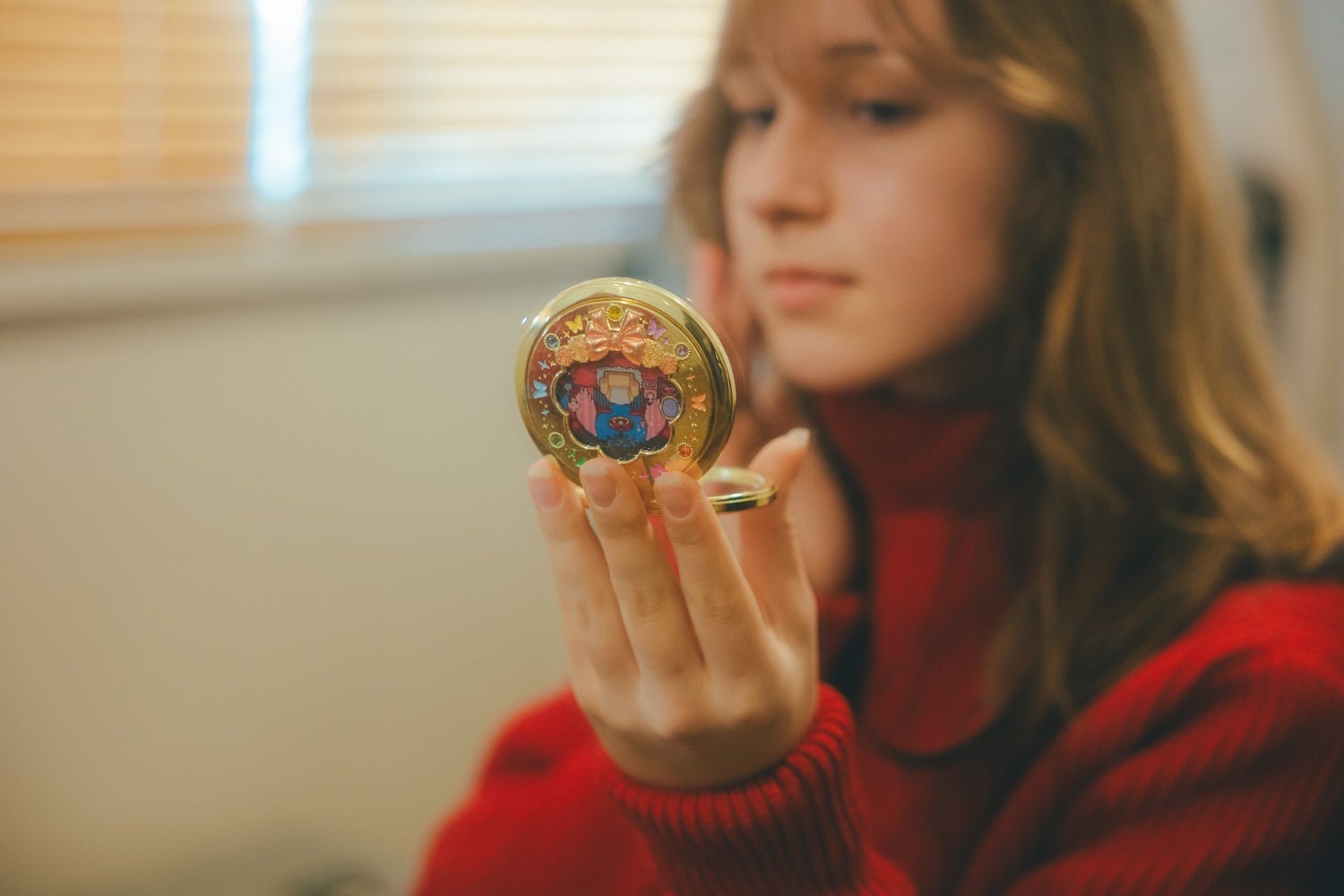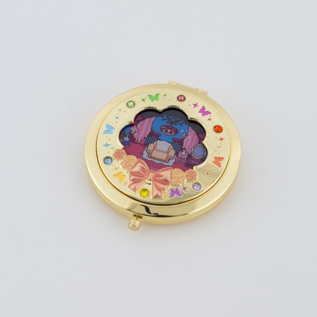 『MOTHER3』のノーウェア島の先住民、マジプシーにオマージュを捧げるゴージャスなコンパクトミラーです。メタル製で、手に持ったときに心地よい重さがあります。片面が等倍鏡、もう片面が拡大鏡(2倍)になっています。フタは、ティーパーティが毎月開催されるエオリアの部屋。ウラには、エオリア、イオニア、リディア、フリギア、ミクソリディア、ドリアの姿を刻みました。