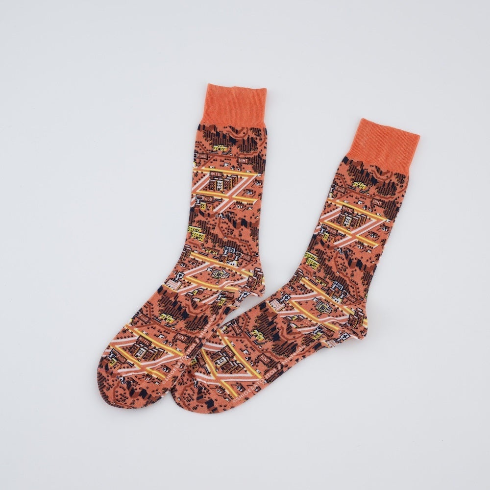 『MOTHER2』のオネットの町並みをプリントした「オネットMAP」は、靴下とは思えない細密な絵柄が特長です。色はレトロなニュアンスがあるグリーンとオレンジ。『スターマン』はブラックとレッドのボディそれぞれに、スターマンを銀色でプリントしました。ぜひ足元のおしゃれをたのしんでください。