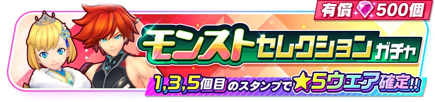 『モンスト』からはアーサー(CV:秋山絵理)、エクスカリバー(CV:小西克幸)の2キャラクターのみ、『白猫プロジェクト NEW WORLD’S』からはオスクロル(CV:茅野愛衣)、シャナオウ(CV:福山潤)の2キャラクターのみの★5ウェアが登場するガチャを開催予定です。本ガチャは有償ジュエル500個限定で5回までまわすことができ、1回目、3回目、5回目のスタンプでは★5ウェアが確定となります。それぞれのキャラクターは限定ウェアも登場します。