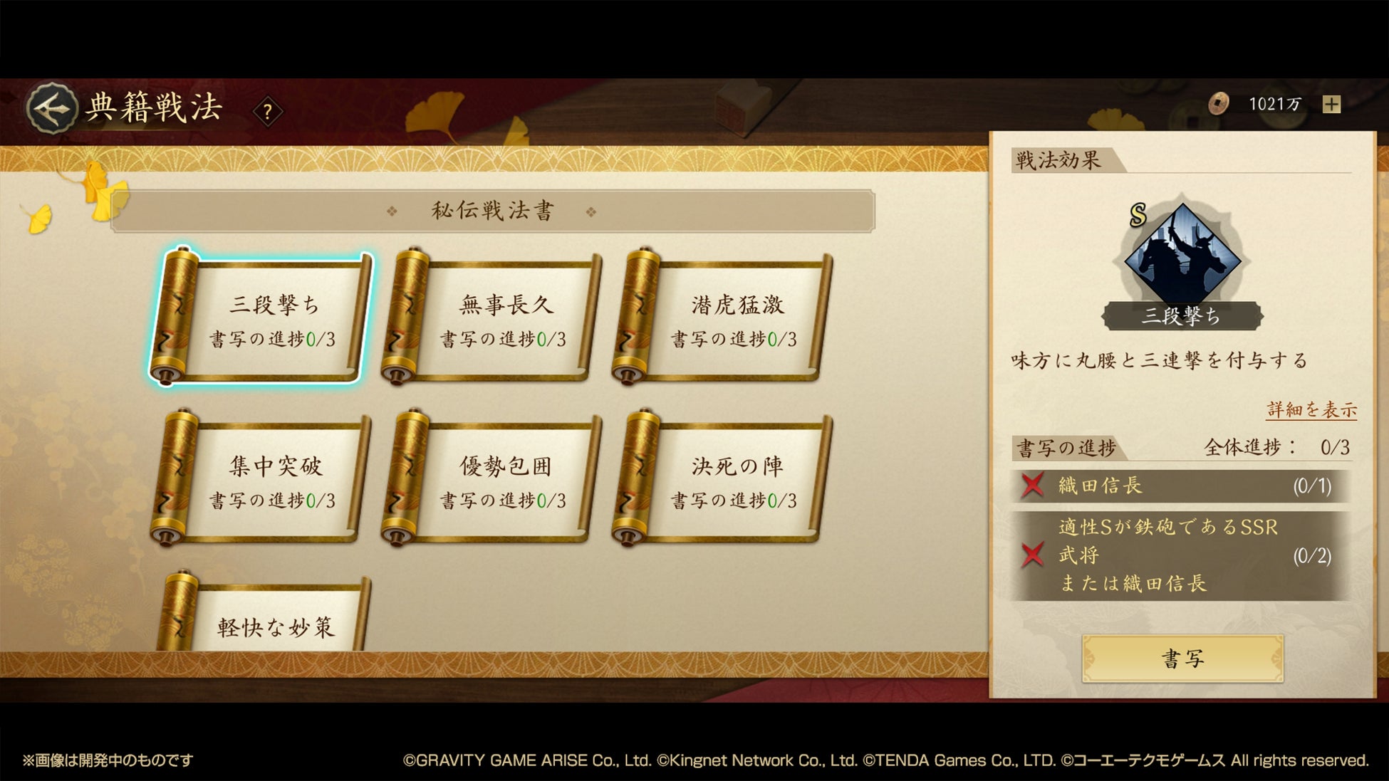 特定の条件を満たすSSR武将を複数消費することで獲得できる新戦法です。典籍戦法は、特定武将をイメージした強力な性能を持っており、獲得した戦法は通常の伝授戦法と同じくすべての武将に習得可能です。この新たな戦法を会得・習得することで、武将のスキル編制や編制バリエーションがより広がります。