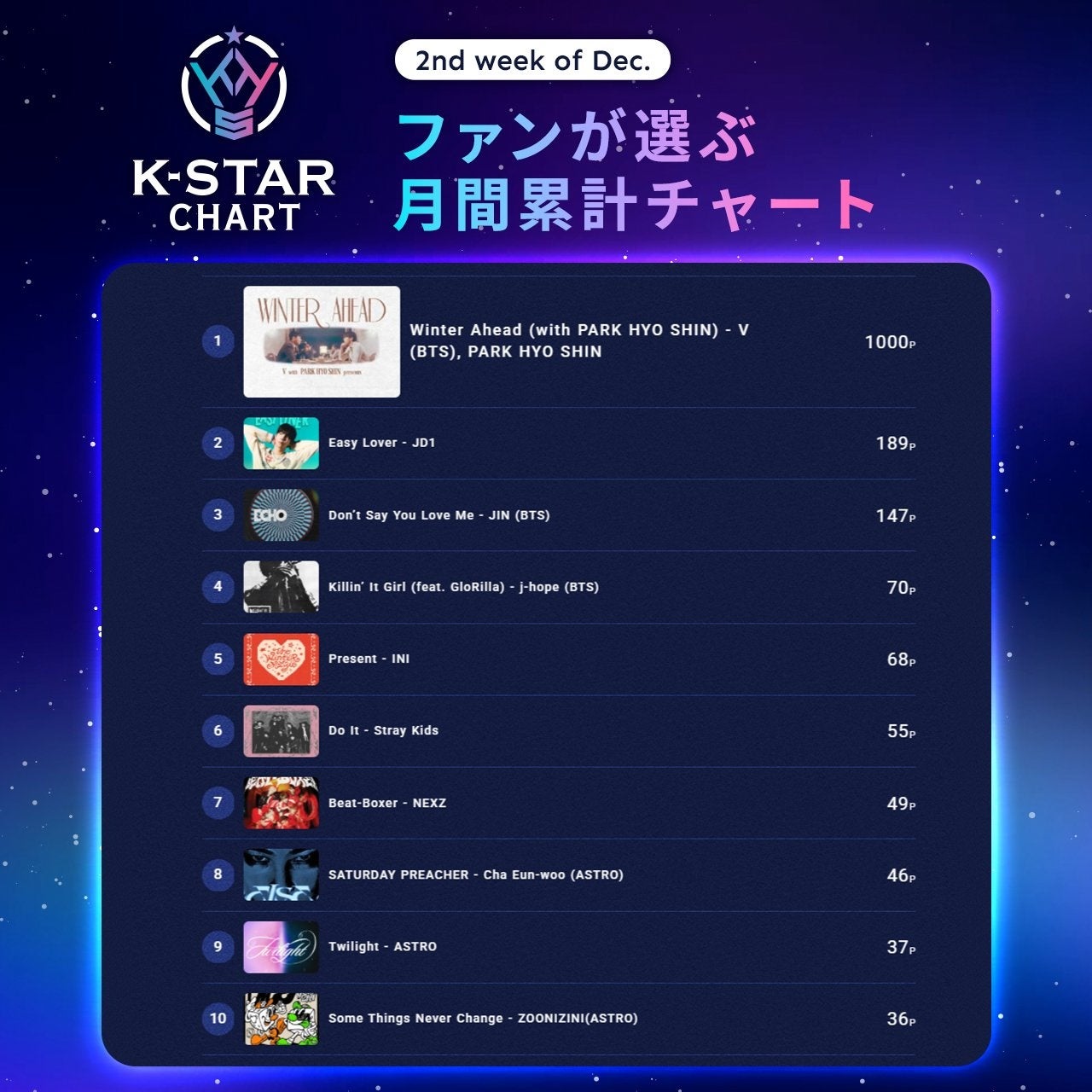 『K-STAR CHART presents POP-K TOP10 Friday』週間チャートで1位を獲得したのは、BTSのVとPARK HYO SHINによる「Winter Ahead (with PARK HYO SHIN)」。番組内でも同楽曲がオンエアされました。
