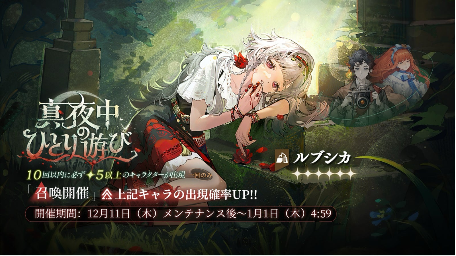Ver3.1「長き夜に汽笛は鳴る」では、新★6キャラクター「ルブシカ(CV:黒沢ともよ)」と「コルヴス(CV:能登麻美子)」が登場します。ルブシカはイベント前半で開催される「真夜中のひとり遊び」召喚で、コルヴスはイベント後半開催の「大地を縫う鉄路」にてそれぞれ獲得可能です。
