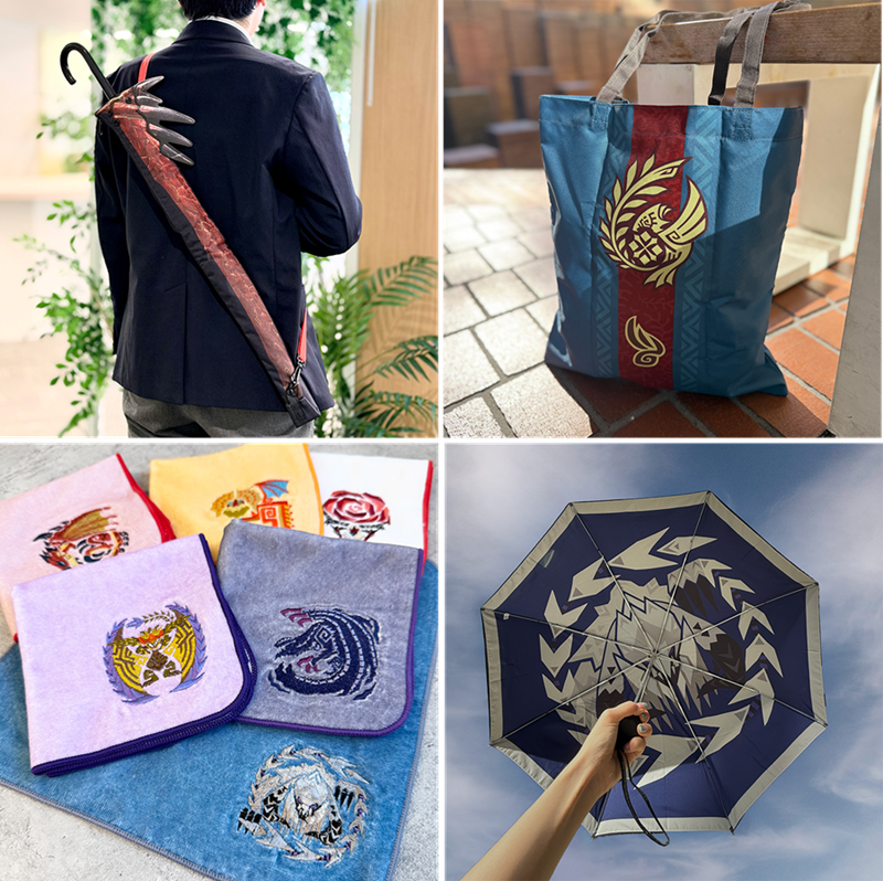 傘を納刀して背中に背負うだけで、すぐに太刀使いのハンターになれる「長傘カバー」をはじめ、撥水加工で雨の日も安心な「エコバッグ」や、濡れてしまったときに万能な「刺繍タオル」。表はブラック・内側はモンスターアイコンという二面性にココロ惹かれる「折り畳み傘」をご用意。どれも入手すれば憂鬱な雨でも出かけたくなる特別なグッズラインナップとなっております。