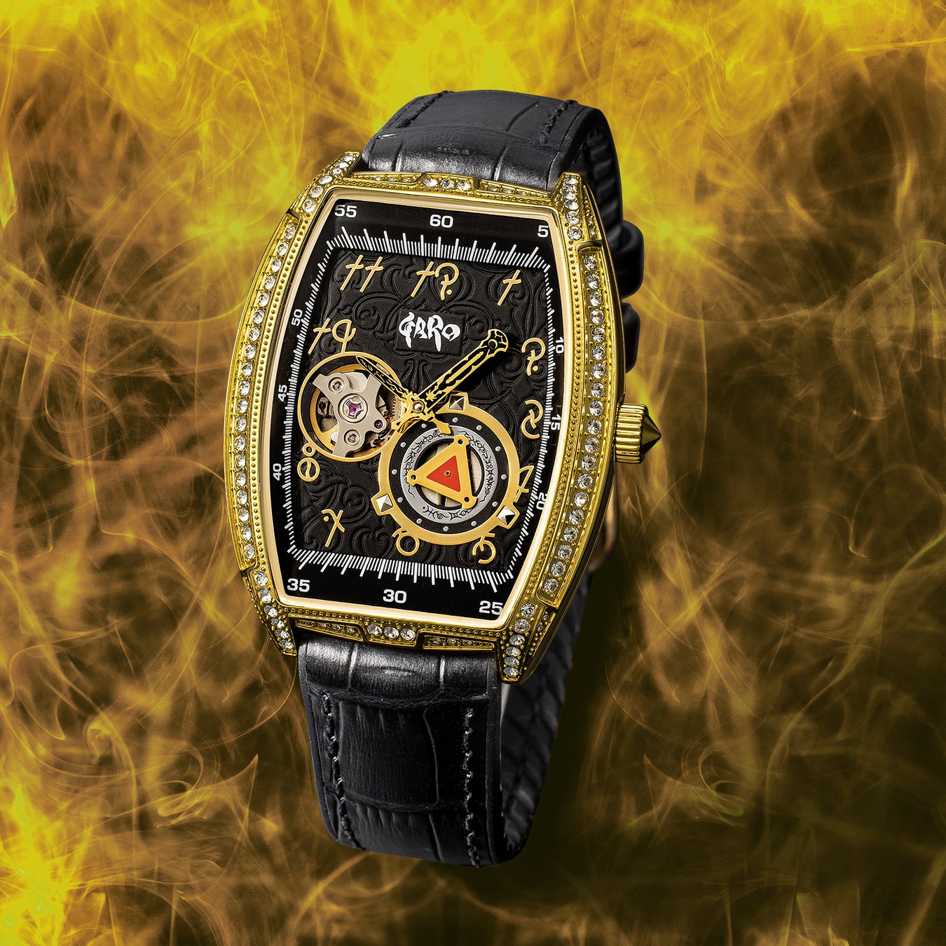 直線と曲線が交錯するトノー型のフォルムにより、鎧を思わせる重厚な造形と、騎士としての美しさを両立。ゴールドカラーのケースが放つ存在感は、一目で牙狼とわかる圧倒的な力強さを腕元に刻み込みます。日常使いとしてはもちろん、限定350本という希少価値の高い1本だけに、ぜひこの機会をお見逃しなく。