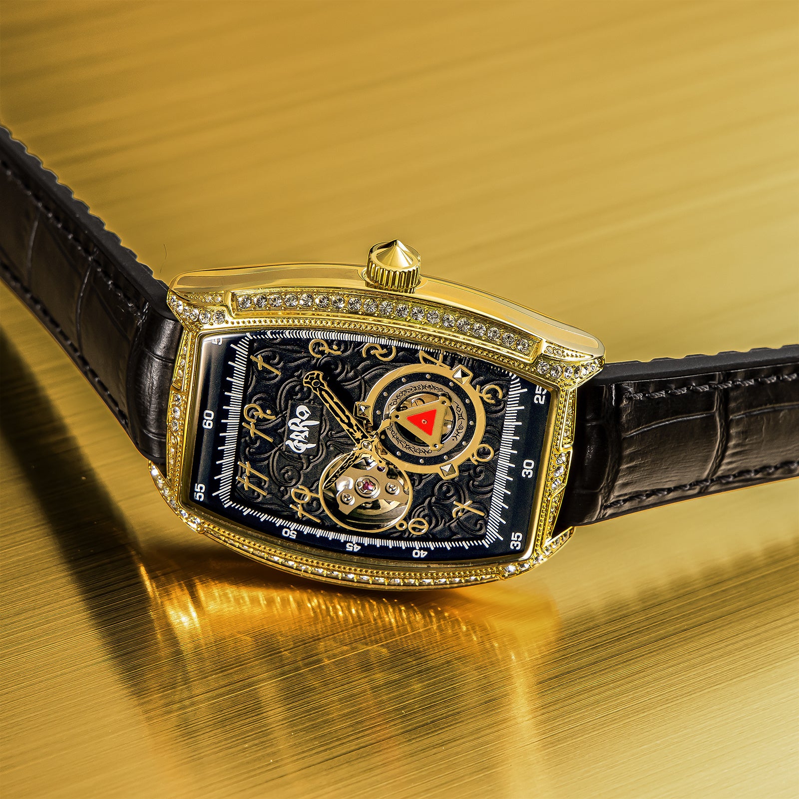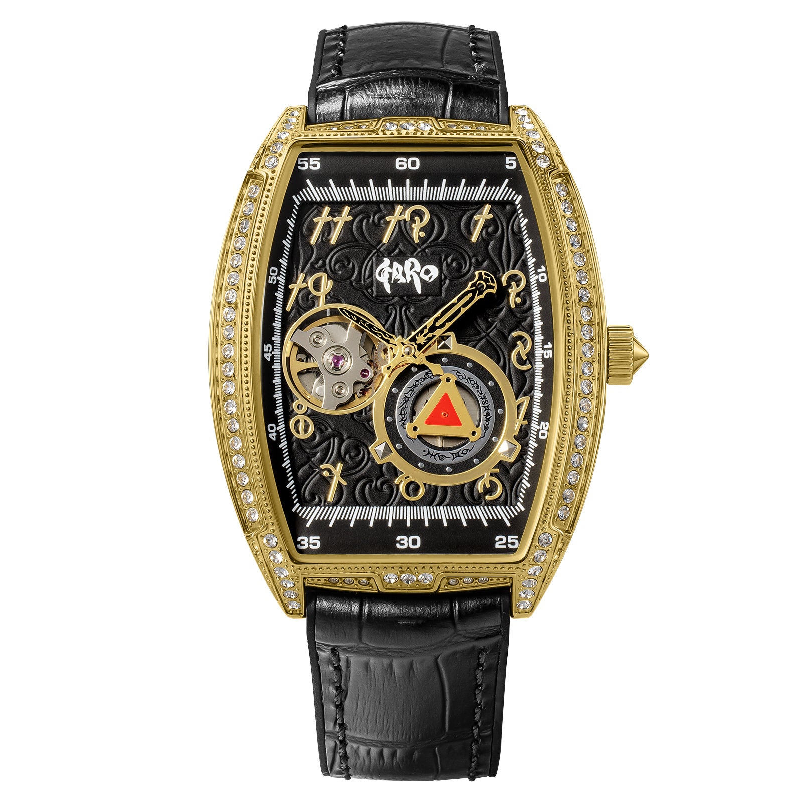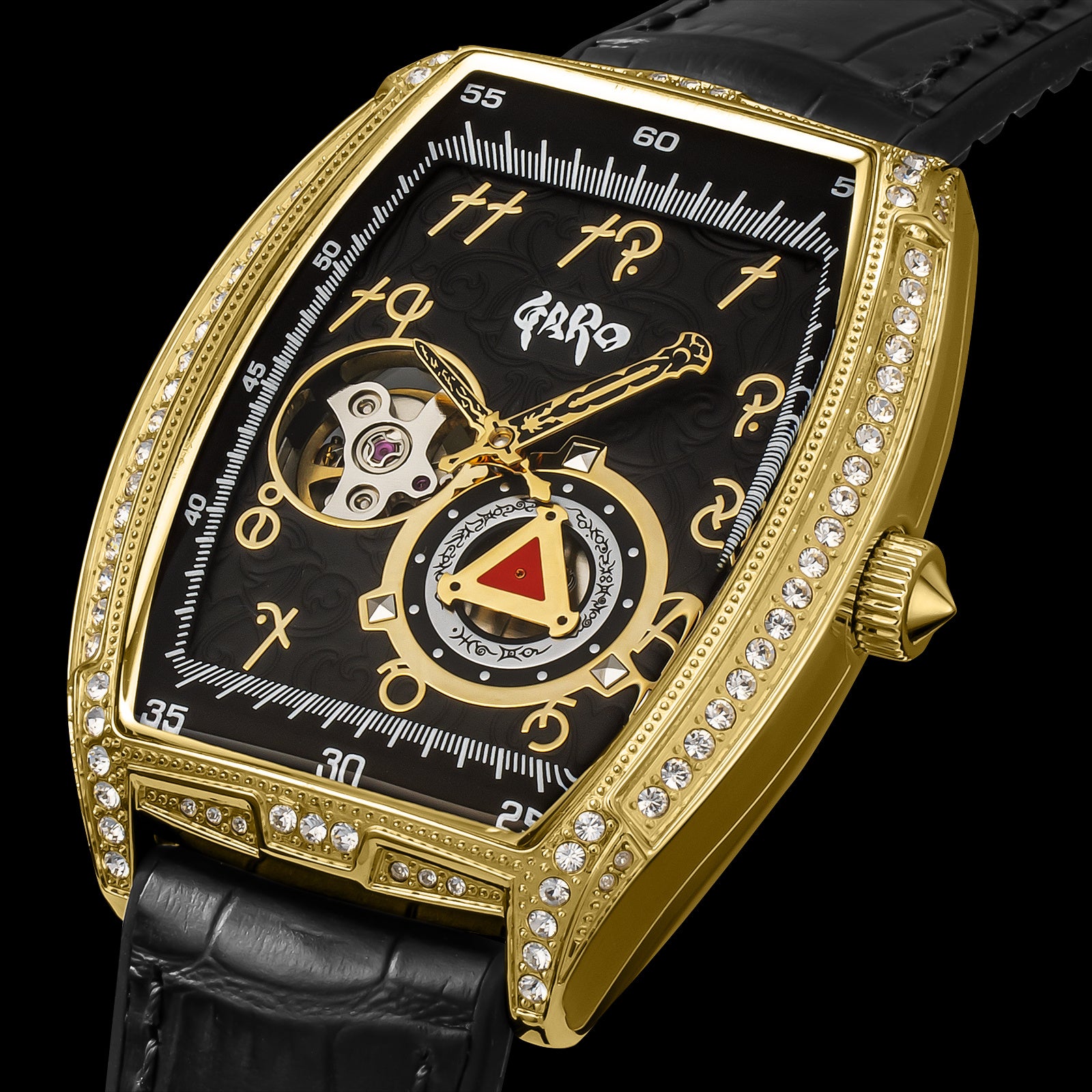 直線と曲線が交錯するトノー型のフォルムにより、鎧を思わせる重厚な造形と、騎士としての美しさを両立。ゴールドカラーのケースが放つ存在感は、一目で牙狼とわかる圧倒的な力強さを腕元に刻み込みます。日常使いとしてはもちろん、限定350本という希少価値の高い1本だけに、ぜひこの機会をお見逃しなく。