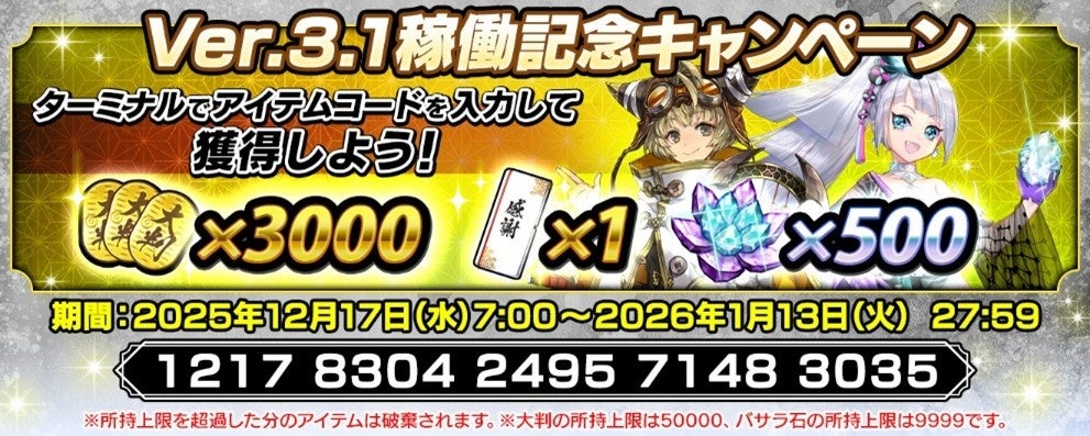 新バージョンの稼働を記念して、ターミナルにアイテムコードを入力いただいた方全員に大判×3000、バサラ石×500と感謝の手紙×1をプレゼントするキャンペーンも実施いたします。
