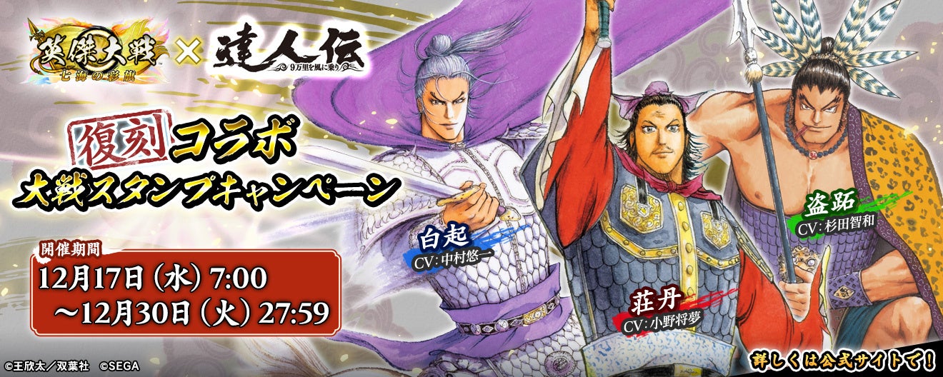 株式会社セガ フェイブ(本社:東京都品川区、代表取締役社長執行役員:杉野行雄)は、本日2025年12月17日(水)より、現在稼働中のアミューズメント施設向け対戦型カードアクションゲーム『英傑大戦 七海の彩旗(以下、英傑大戦)』において、新バージョン「Ver.3.1.0」稼働と、漫画家 王欣太先生との復刻コラボイベントを開始したことをお知らせいたします。