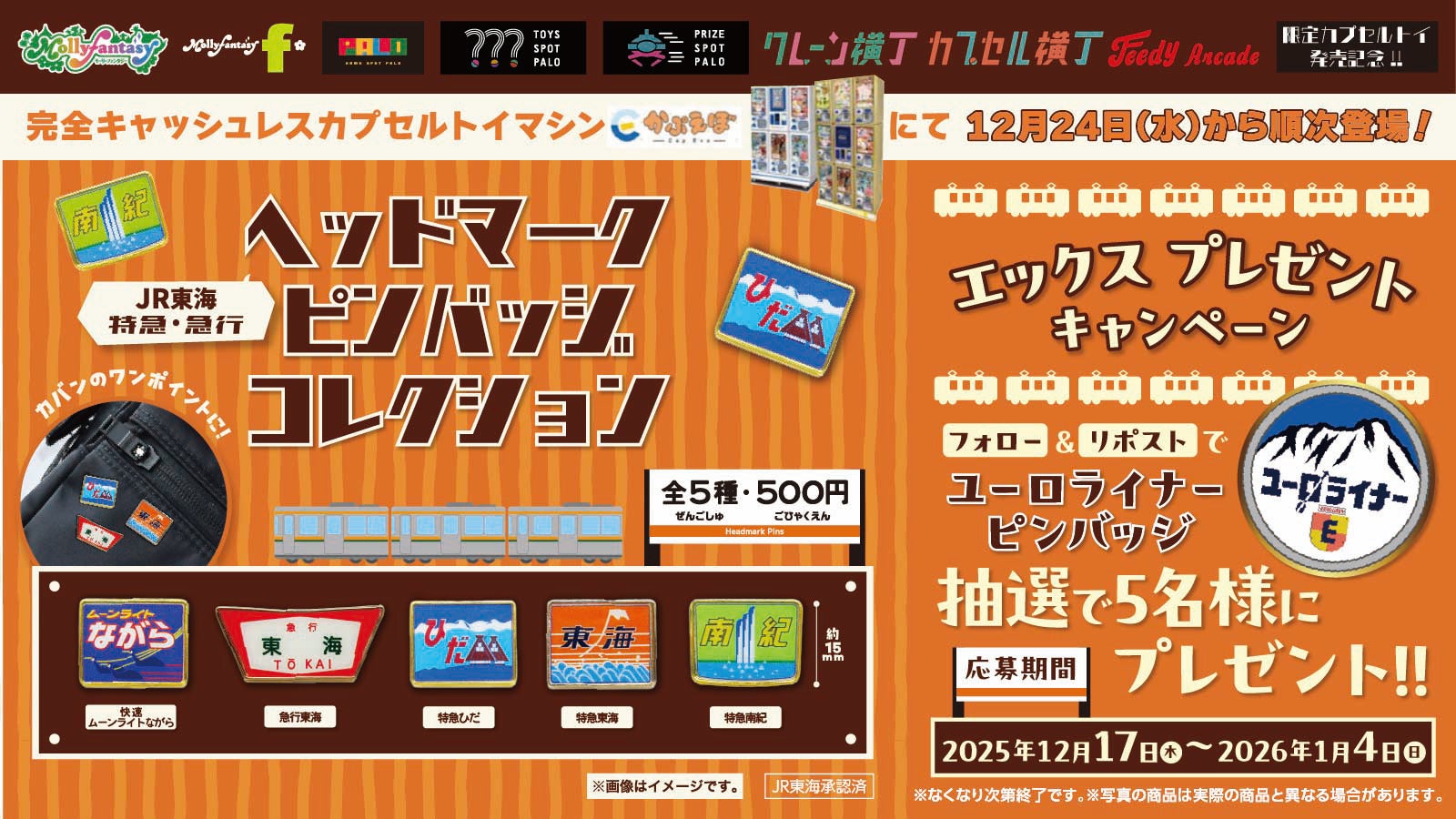 株式会社イオンファンタジー(本社:千葉県千葉市、代表取締役社長:藤原徳也、以下、当社)は、「JR東海」のカプセルトイ用商品「JR東海 特急・急行ヘッドマーク ピンバッジコレクション」を、アミューズメント施設「モーリーファンタジー」「PALO」、カプセルトイ専門店「TOYS SPOT PALO」「カプセル横丁」などに設置する当社オリジナル完全キャッシュレスカプセルトイマシン「かぷえぼ」で12月24日(水)より順次展開いたします。