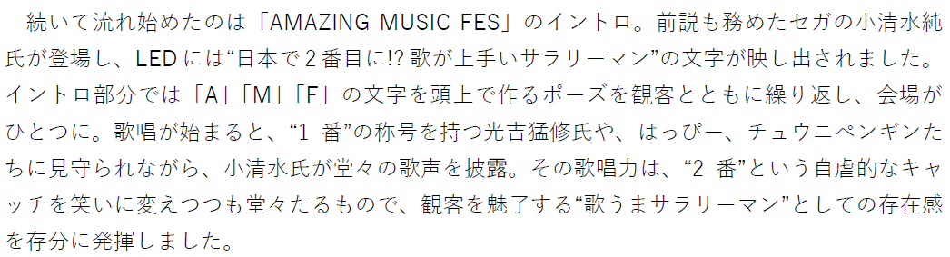 次に、“日本一歌の上手いサラリーマン”としてゲームファンに広く知られるセガ社員の光吉猛修氏が、金色の着物姿で登場し、会場からは大歓声と笑いが起こりました。「出オチか!」という自虐的なコメントで観客を沸かせた後、ゲキチュウマイ(オンゲキ・CHUNITHM・maimai でらっくす)のマスコットキャラクターであるはっぴーとチュウニペンギンを従えて「怒槌(イカヅチ)」を披露。さらに「マツケンサンバⅡ」を美声で歌い上げ、会場は一気にお祭りムードに包まれました。