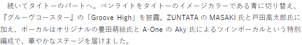 タイトーのステージは、『グルーヴコースター』シリーズの楽曲を中心に構成。まず、同シリーズのナビゲーターキャラクター・リンカ役の声優である豊田萌絵氏が登場し、「LINK LINK FEVER!!!」でライブがスタート。豊田氏による生歌唱に、観客は1曲目から大きな盛り上がりを見せました。その後、バトンを受けた魂音泉のらっぷびと氏が「まだまだ疲れてる場合じゃないぜ!」と呼びかけ、『グルーヴコースター』より「揺蕩うLove」「Arts in the Hearts」、そして「ゆけむり魂温泉II」を続けて披露しました。