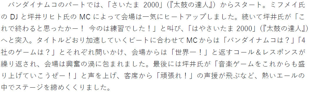 立花理香氏にDJが交代すると、「R.Y.U.S.E.I.」や「江南スタイル」「Crowd Control」のパフォーマンスで会場を驚かせた後、「痛快リズムアクション「B.B.K.K.B.K.K.」」によるコールアンドレスポンスや「Kattobi舞高Riders × 電車で電車でGO!GO!GO!GC! -GMT remix- × ナムコットメドレー」の各社のマッシュアップによるウェーブ、「conflict(斉唱)」「ウソテイ」によるシンガロングなど観客一体となって盛り上がりました。ラストにはメーカーの垣根を超え平和を願う本イベントならではの選曲となった「We are the world」が流れ、ペンライトが左右に揺れる穏やかなムードの中ステージが締めくくられました。