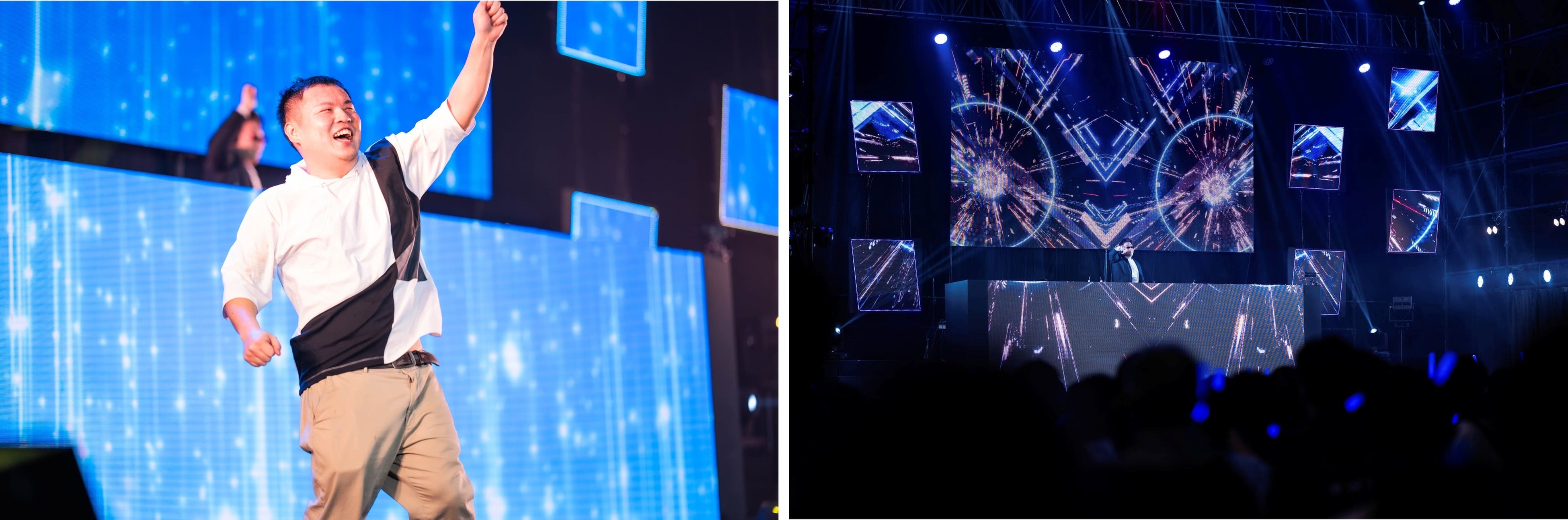 『Arcaea』でも使用されている「Aether Crest: Celestial」(『CHUNITHM』)の後は、サウンドクリエイター・xi氏へDJが交代。代表曲「FREEDOM DiVE」のイントロが流れると、会場からは大きなどよめきと歓声が上がりました。その後も、多くの音楽ゲームで親しまれている「Halcyon」など人気楽曲が続き、ラストは「お待たせしました!『カレスコ』です!」というアナウンスとともに、『maimai でらっくす』の壮大な楽曲「Xaleid◆scopiX(カレイドスコーピックス)」を披露。圧巻のパフォーマンスでステージを締めくくりました。