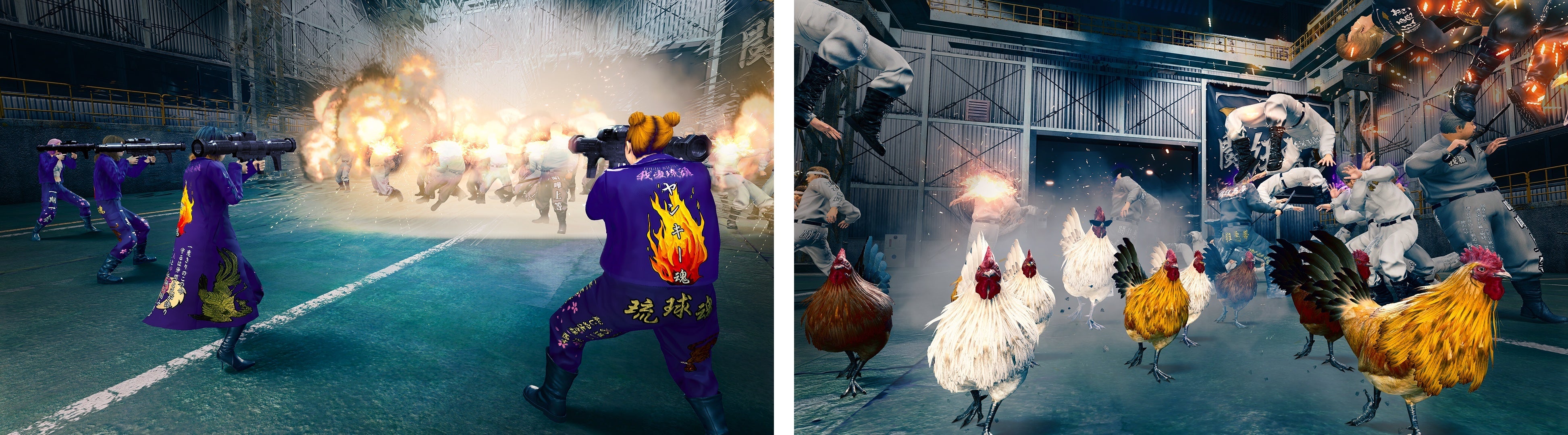 さらに、血闘で使える「ツッパリ兵器」も購入可能。味方が撃つロケットランチャーのほか、敵陣へ突入するニワトリなどさまざまなユニークな兵器が登場する。お金を使ってチームの戦力を整えよう。