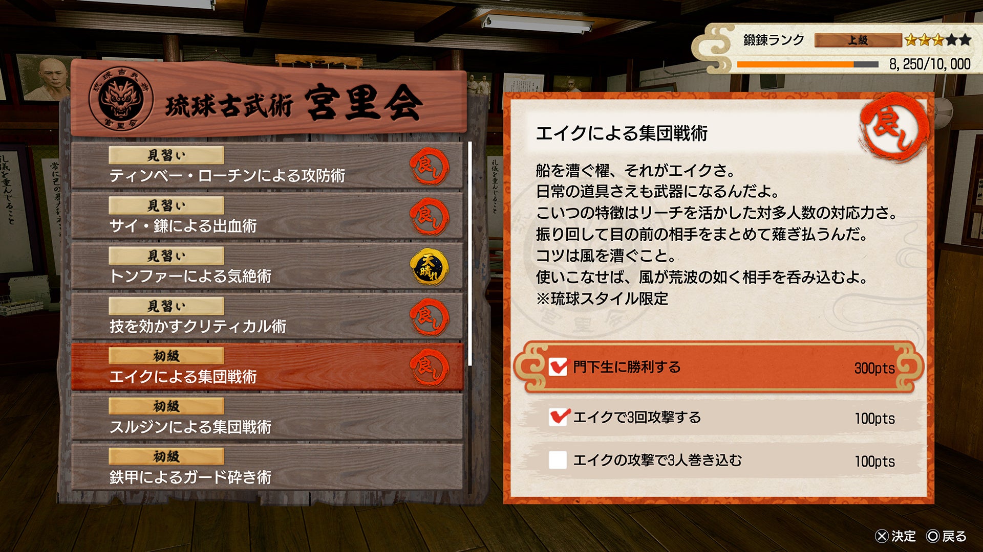 ミヤさんが師範をつとめる宮里道場では、様々な稽古を受けることができ、琉球スタイルの戦い方をはじめとしたバトルのいろはを学べる。さらに、稽古を続けていると昇級試験に挑戦でき、晴れて合格できれば、ミヤさんから宮里流秘伝の奥義を伝授してもらえる。