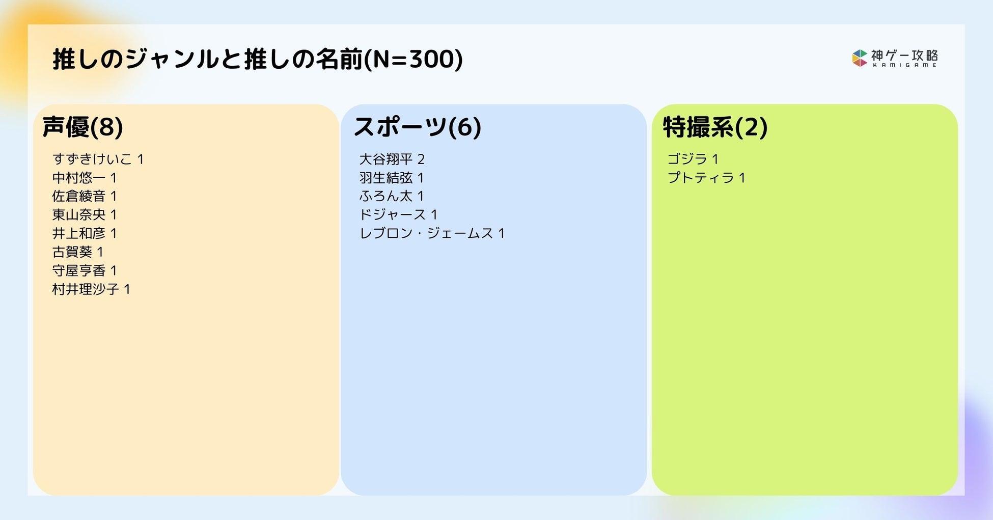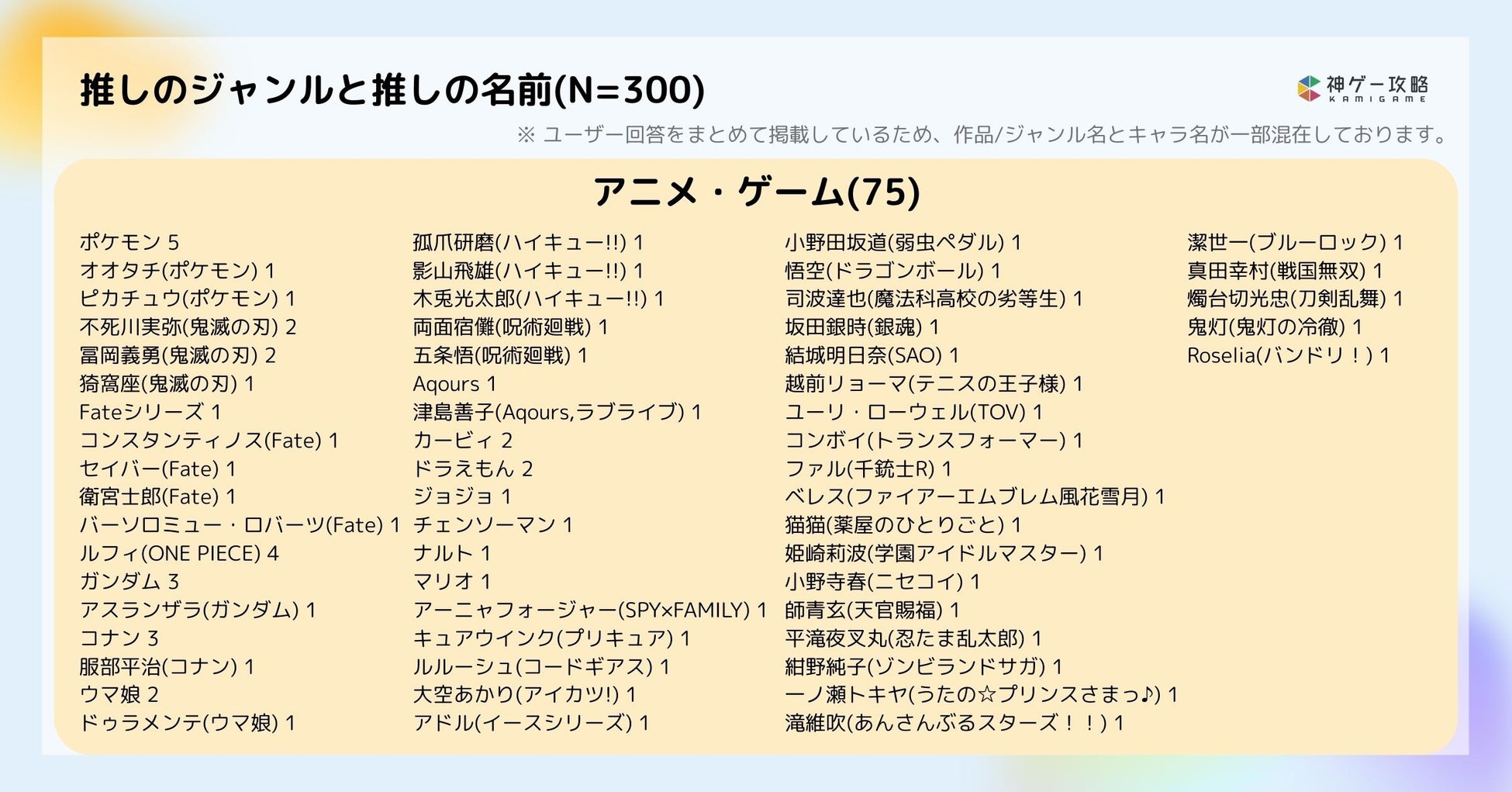 本調査では、このうち「推しがいる」と回答した人の中から、日常的にゲームをプレイしている300名を対象に行った本調査の結果を発表します。