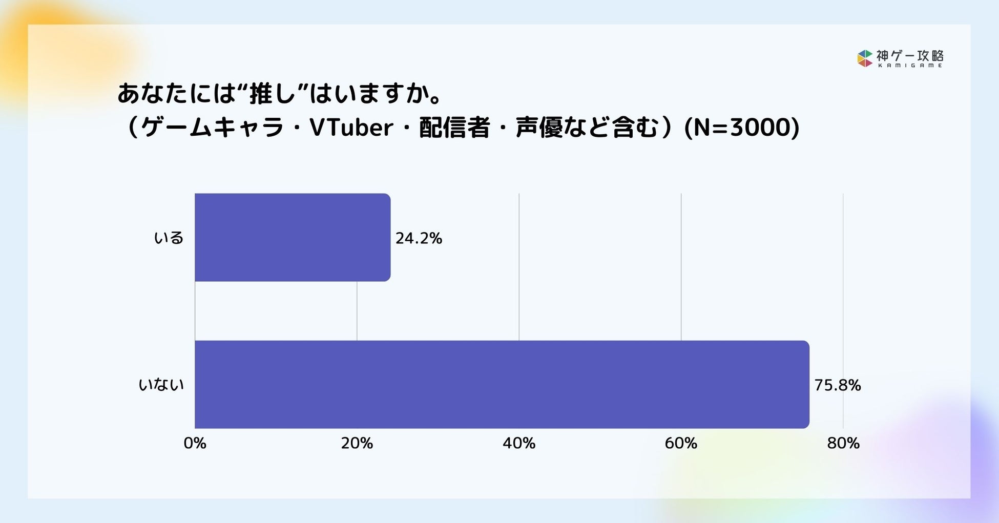 非ゲームユーザーを含む3000人を対象に行った事前調査では、「推しがいる」と回答した人は全体の24.2%という結果でした。