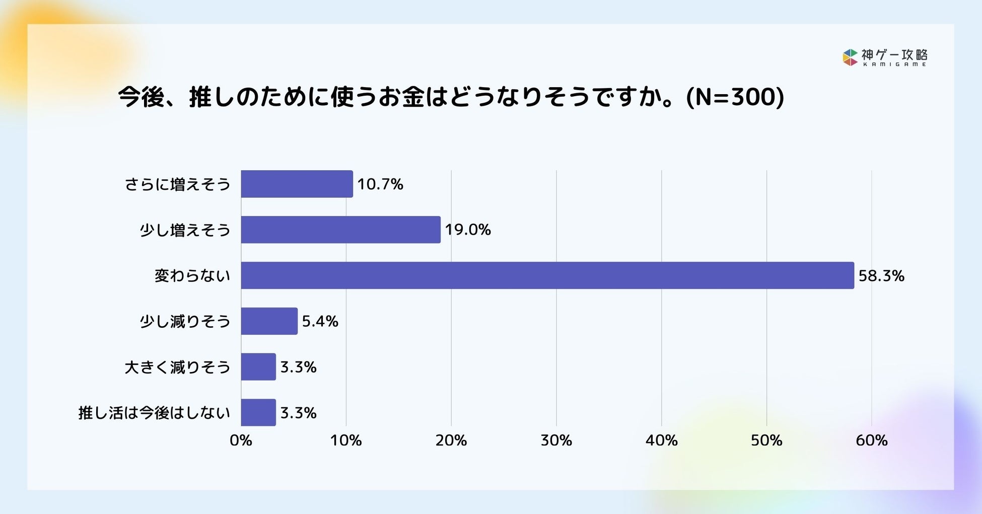 今後、推しのために使うお金の変化は、変わらないという回答が58.3%で最多でした。