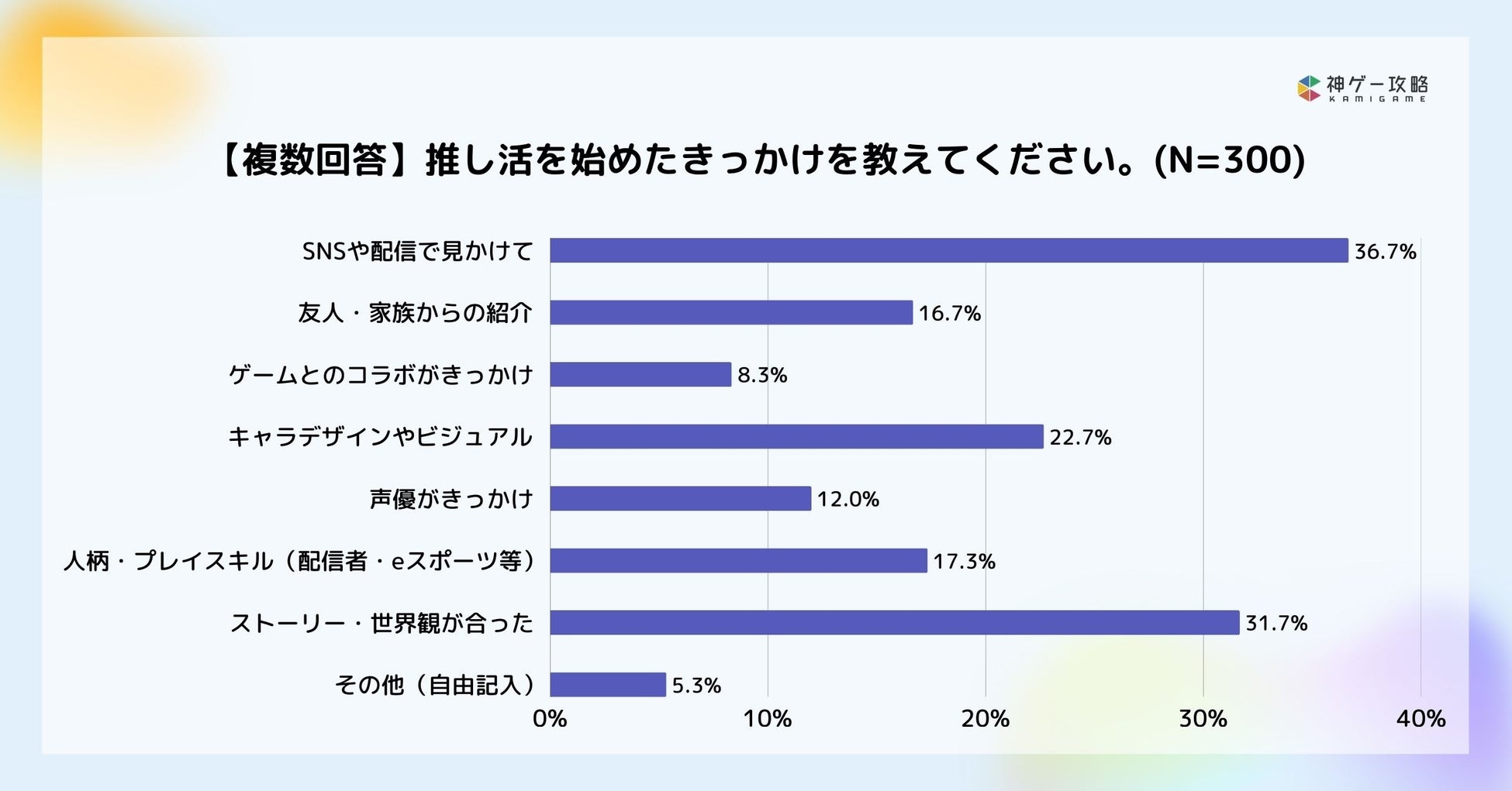 推し活を始めたきっかけとして最も多かったのは、「SNSや配信で知った」の36.7%で、次点では「ストーリーや世界観に共感した」が31.7%という結果でした。