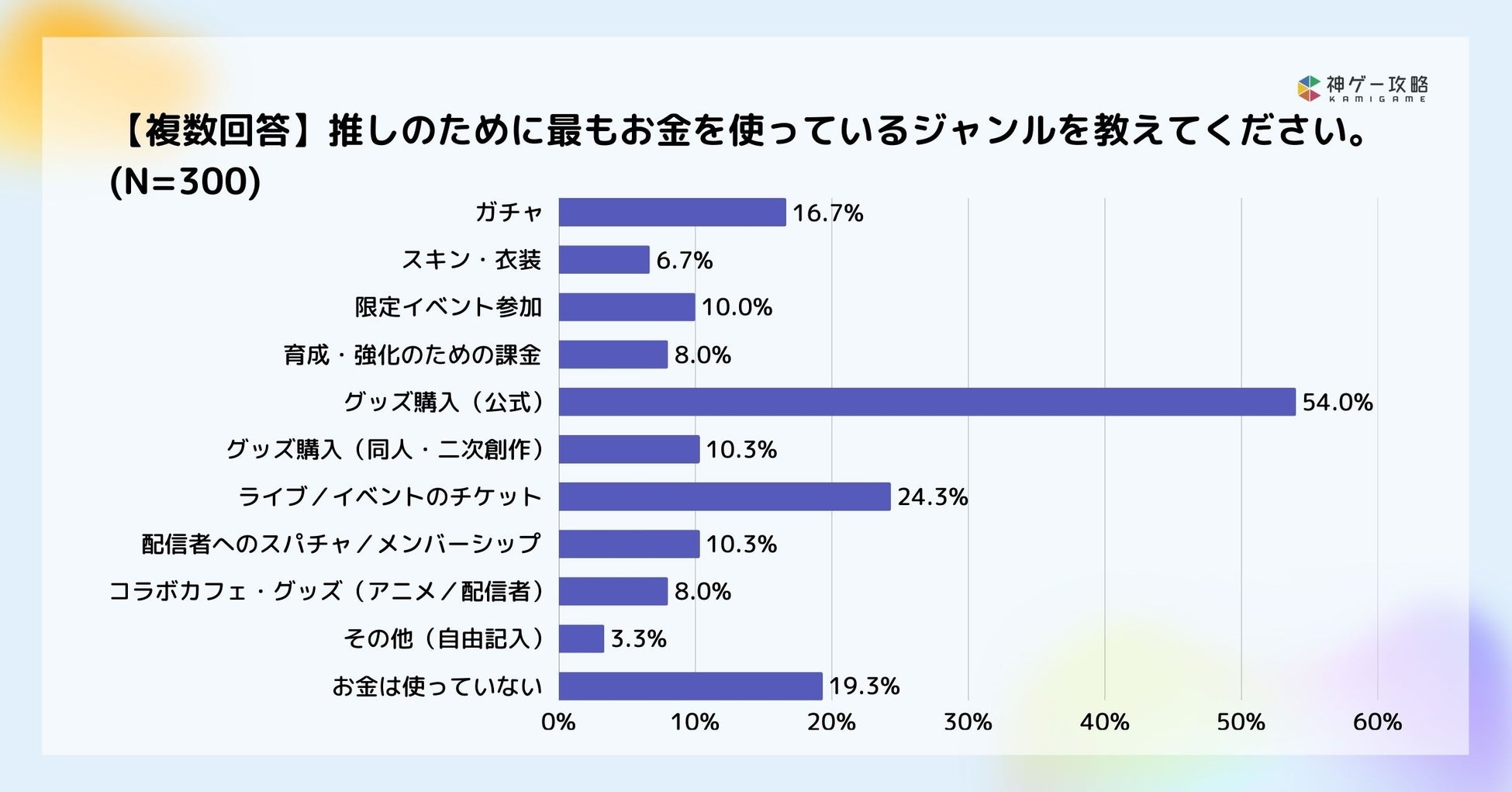 推し活において最もお金を使っているジャンルは、「公式グッズ購入」が54%で最多でした。