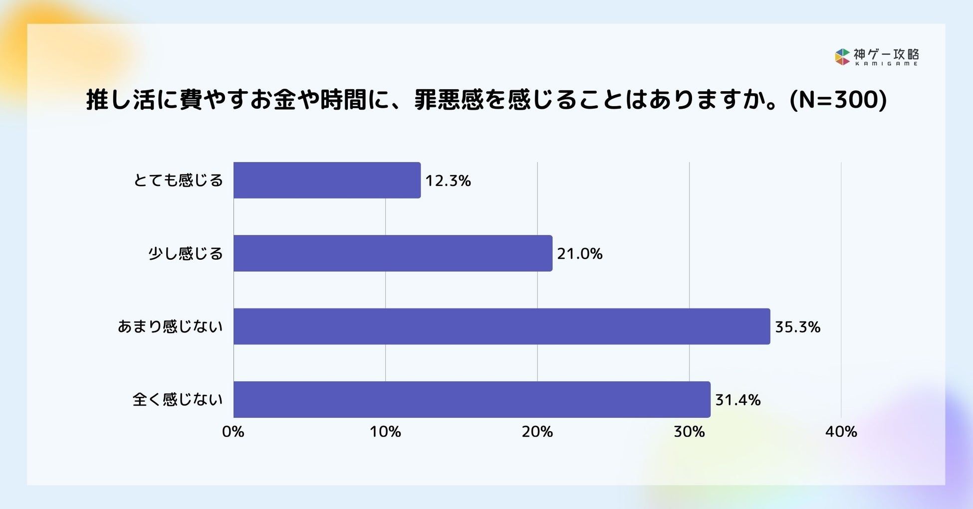 推し活に費やすお金や時間に対する罪悪感については、「あまり感じない」「全く感じない」と回答した人が合計66.7%となり、多くの人が前向きに推し活を楽しんでいることが分かりました。