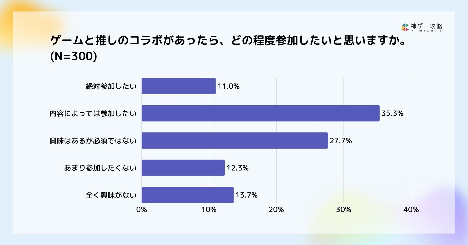 一方で「あまり参加したくない」という回答は12.3%あり、ゲームユーザーの中でも推しとゲームを分けて考えている人が一定数いることが分かります。