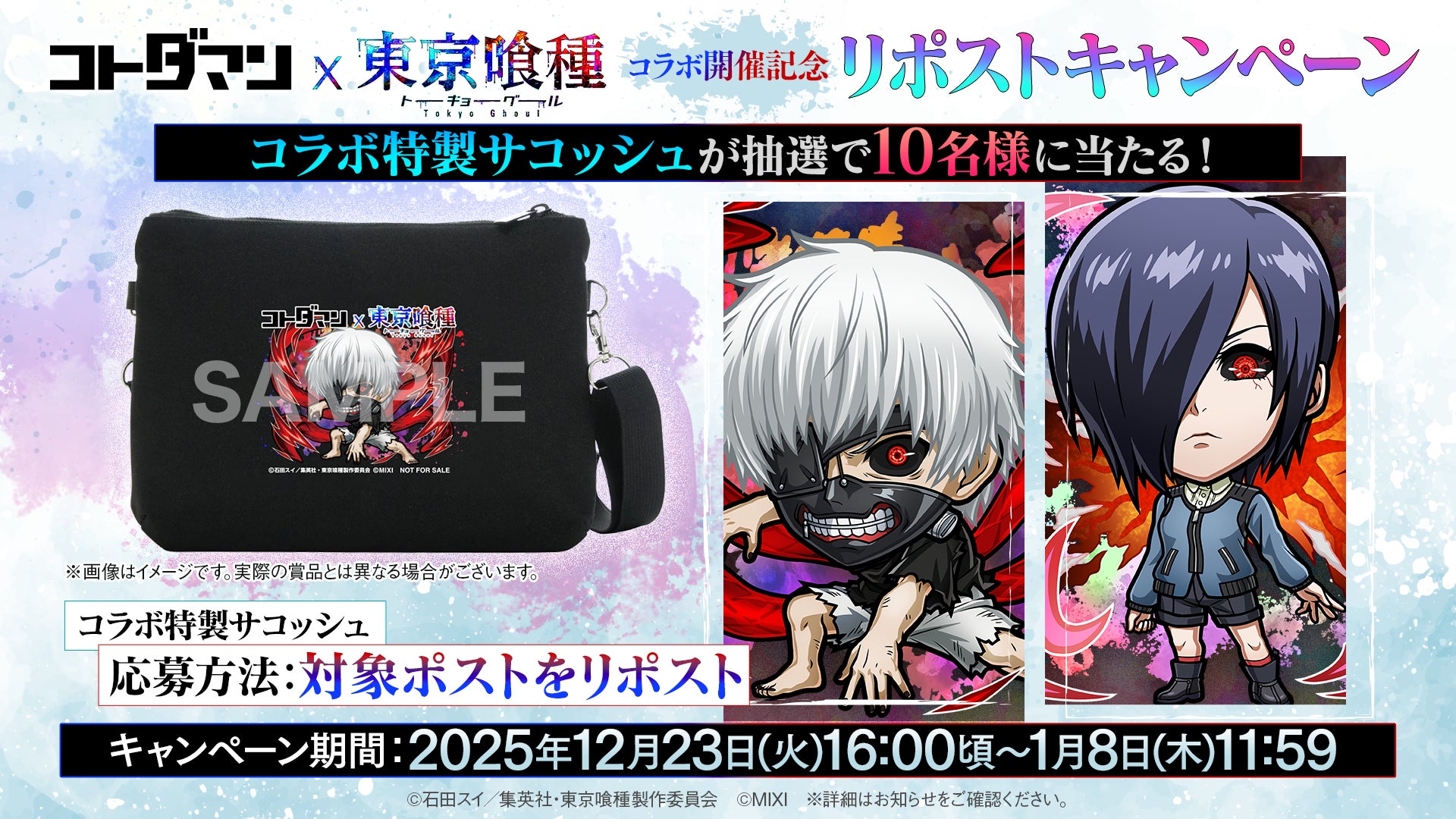 さらに、本日12月19日(金)よりコラボ記念スペシャルPVを公開します。そのほか、『コトダマン』×TVアニメ『東京喰種トーキョーグール』コラボ召喚コトダマンセットや「コラボ特製サコッシュ」などが抽選で当たるXキャンペーンを開催します。