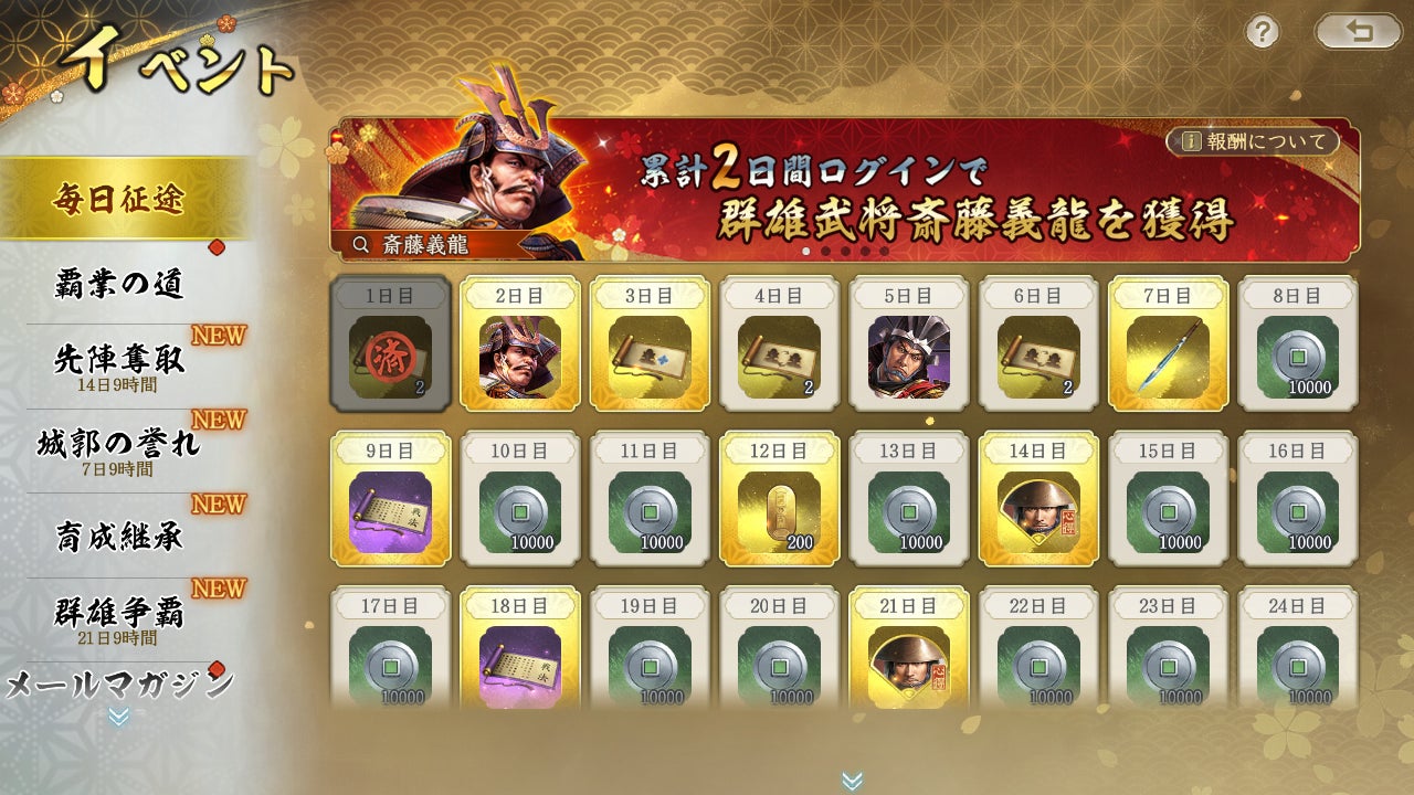 イベント「毎日征途」で、毎日ログインするだけで、2人の星5武将(斎藤義龍、陶晴賢)、小判、銀銭、覚醒用巻物、武名の証、武将継承用巻物などの報酬がゲットできます。