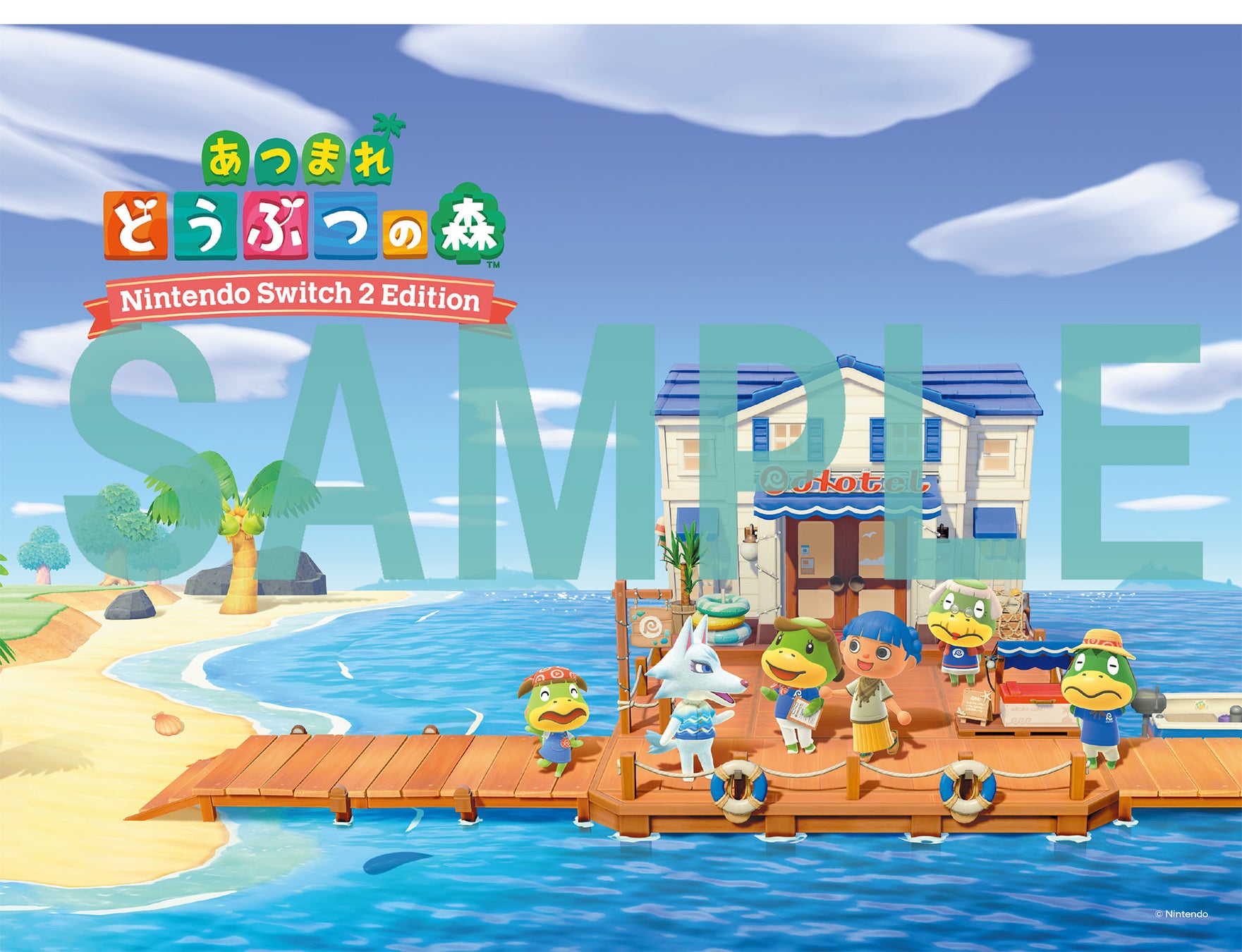 そしてもうひとつは、『あつまれ どうぶつの森』特製イラストカード! 『あつまれ どうぶつの森』Ver.3.0へのアップデートで島の桟橋にオープンする「リゾートホテル」。ホテルを運営するかっぺい一家が、お客様をお出迎えする様子が描かれたイメージビジュアルをB5サイズにプリントしました。