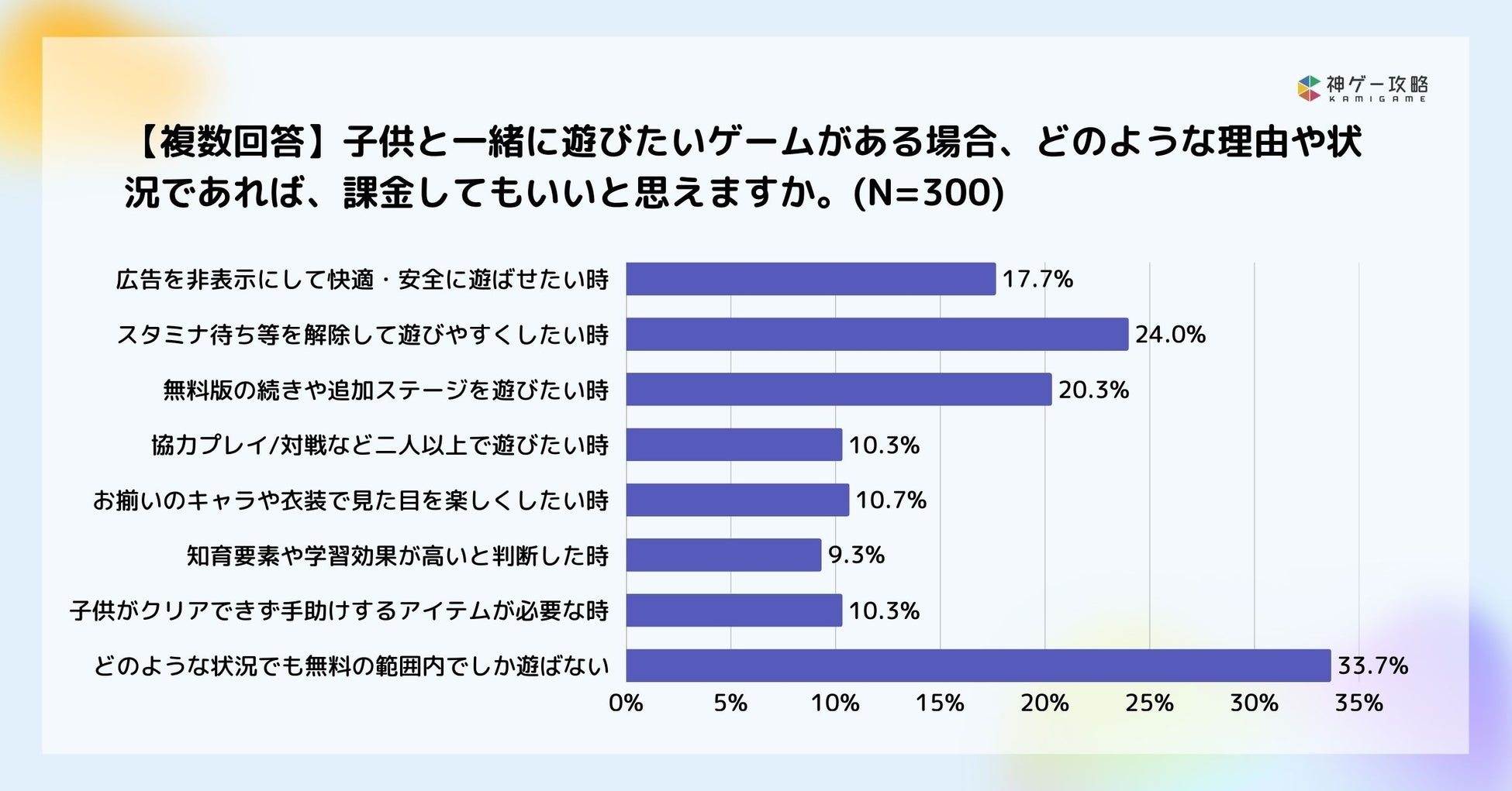 子供と一緒に遊ぶゲームで課金してもよいと感じる条件としては、「スタミナ待ち等を解消したい時」(24.0%)、「無料版の続きや追加ステージを遊びたい時」(20.3%)が上位となりました。