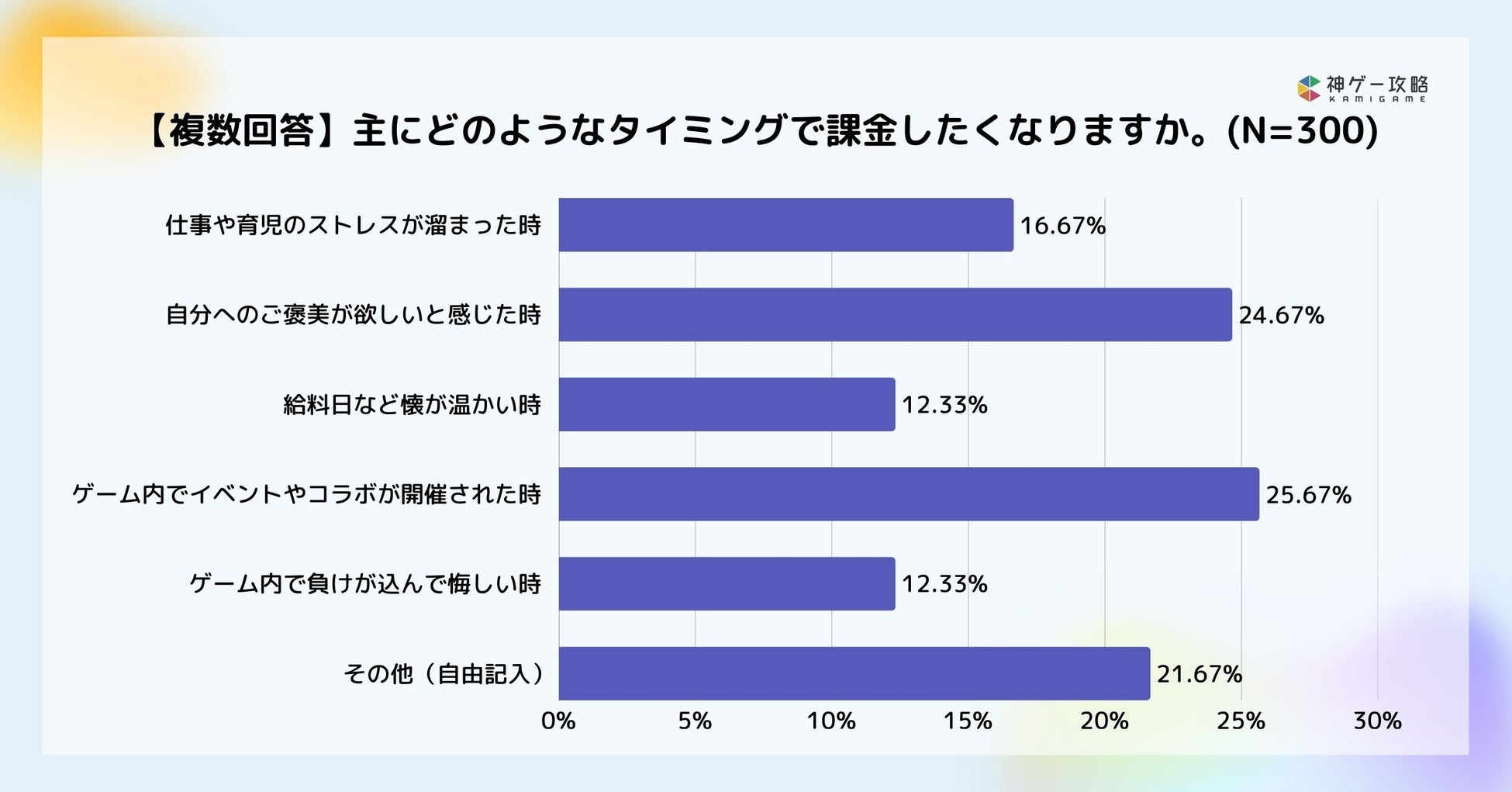 課金したくなるタイミングは「ゲーム内で期間限定イベントやコラボが開催された時」が最多で25.7%、次点で「自分へのご褒美が欲しいと感じた時」が24.7%という結果でした。