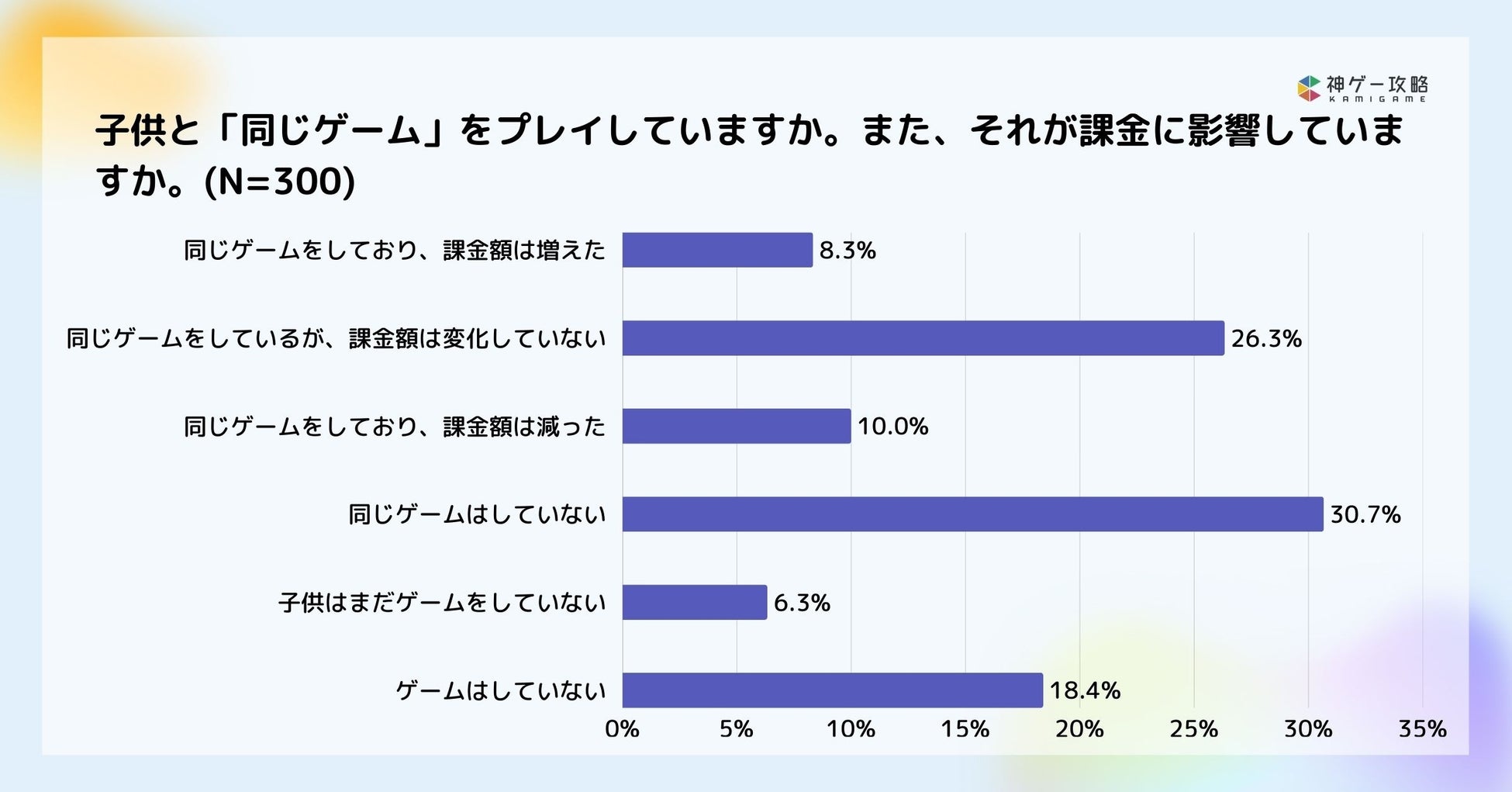 一方で、「同じゲームをしているが、課金額は変化していない」と回答した人も26.3%と多く、子供と同じゲームをプレイしていても、必ずしも課金額が増減するわけではないことが分かります。