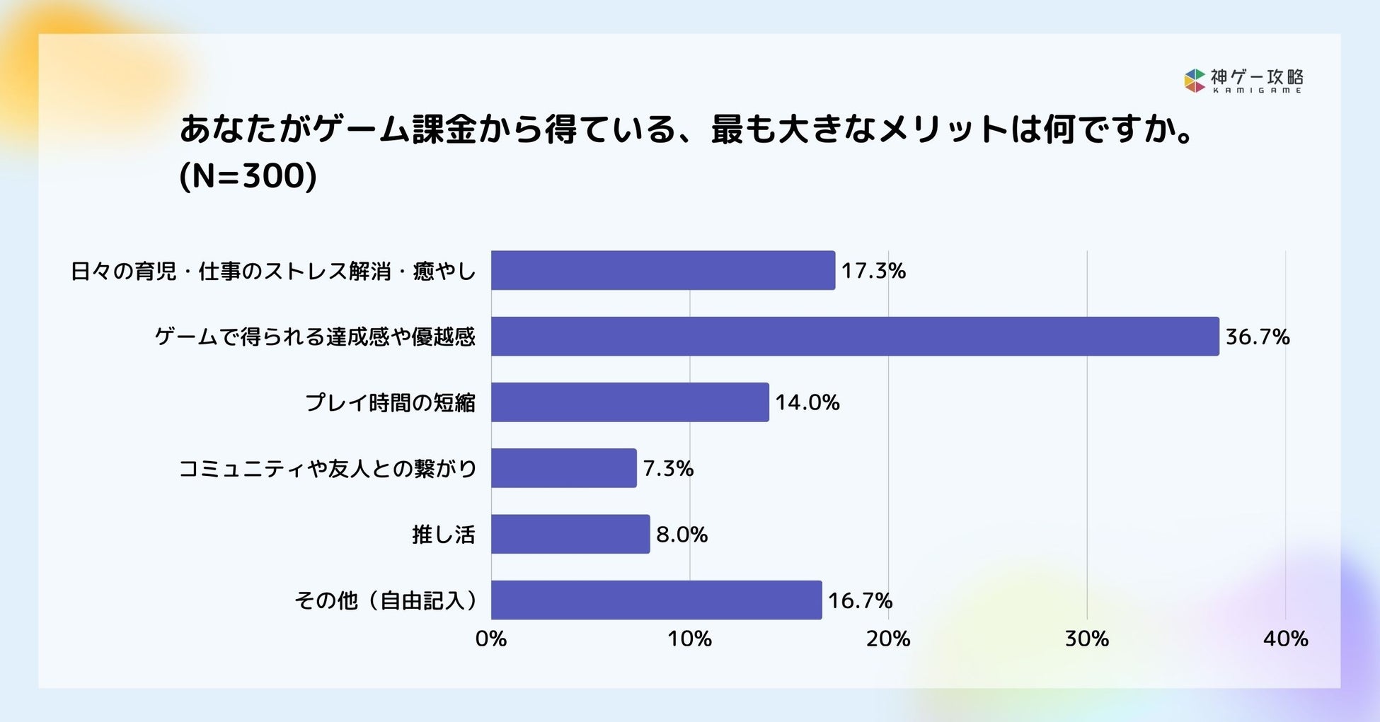 ゲーム課金から得られる最大のメリットとして最も多かったのは、「ゲームで得られる達成感や優越感」で36.7%でした。