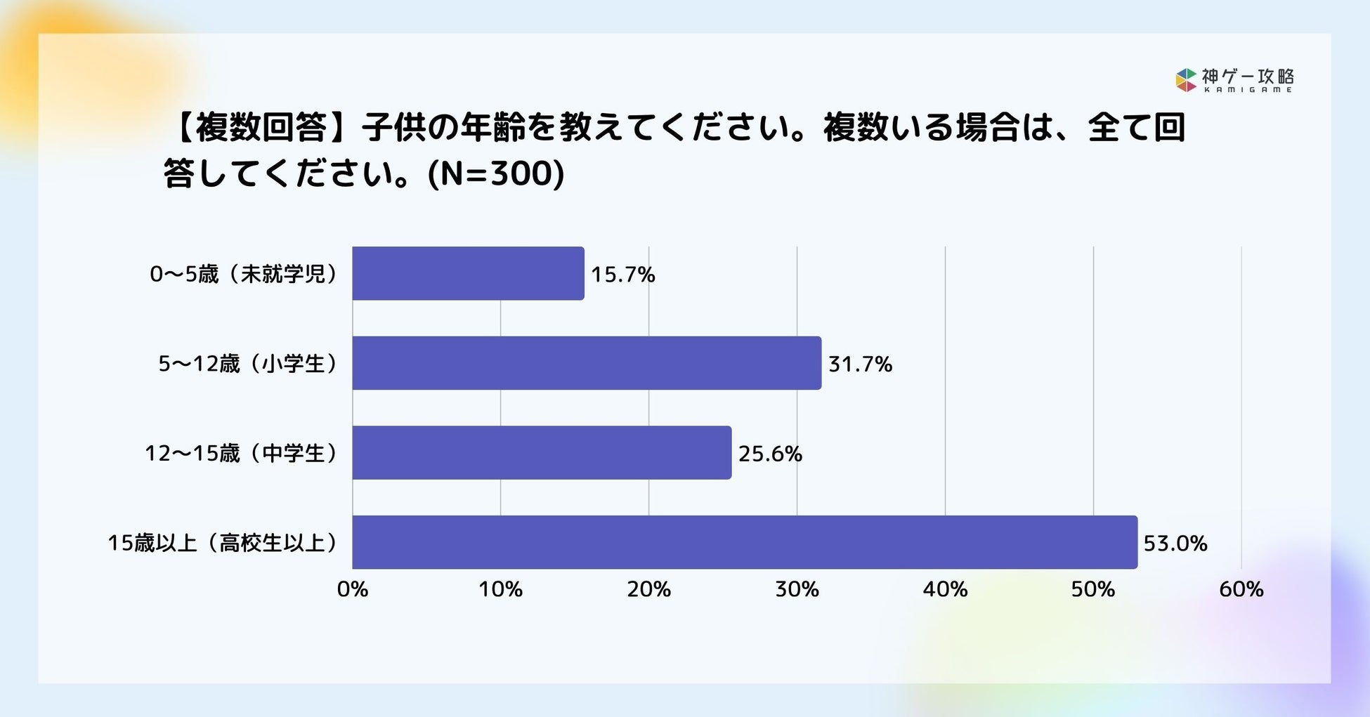 未就学児(0〜5歳)の子供を持つ回答者も15.7%おり、幅広い年齢層の子供を持つ家庭の声が集まっています。
