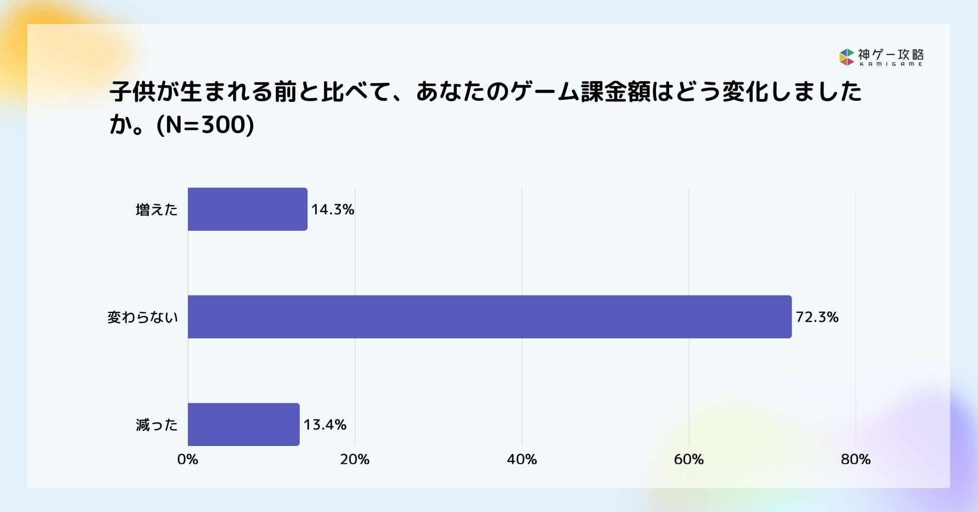 子供が生まれる前と比べた課金額の変化については、「変わらない」と回答した人が72.3%と大多数を占めました。