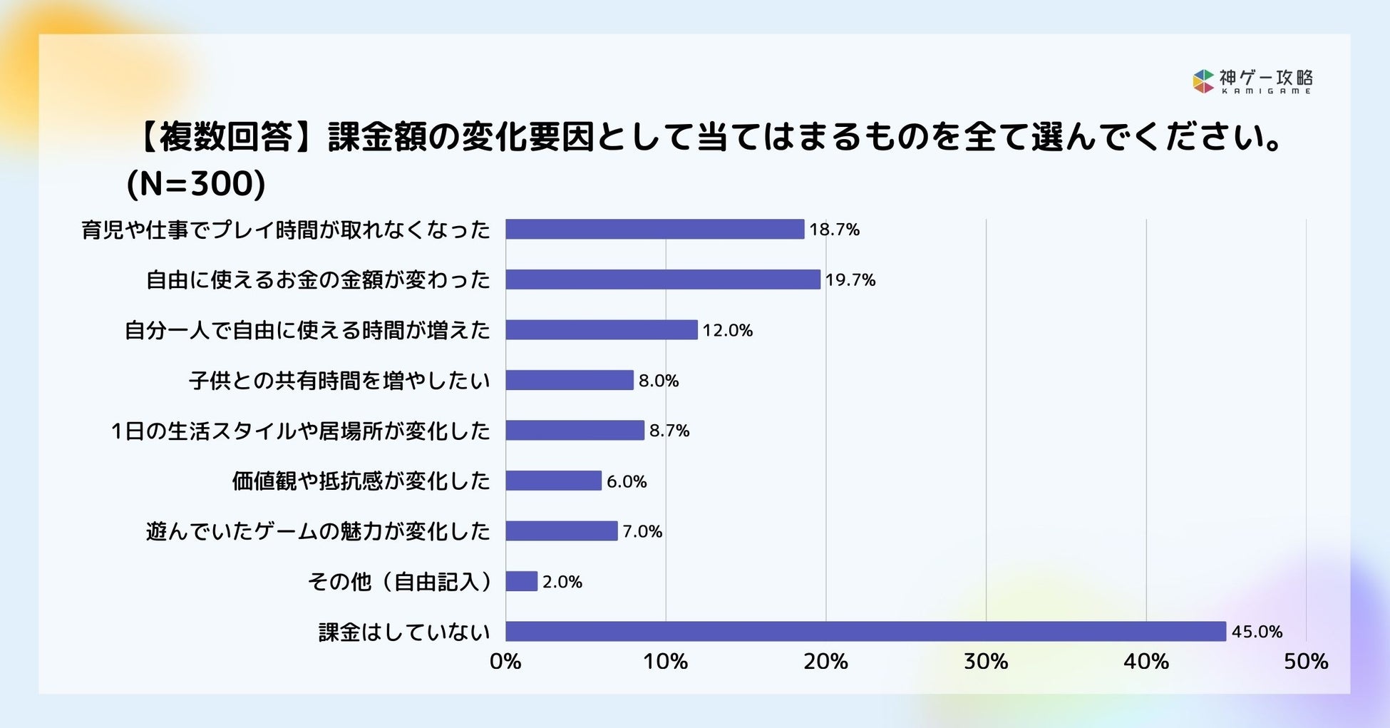 課金額が変化した理由としては、「自由に使えるお金の金額が変わった」(19.7%)、「育児や仕事でプレイ時間が取れなくなった」(18.7%)が上位となりました。