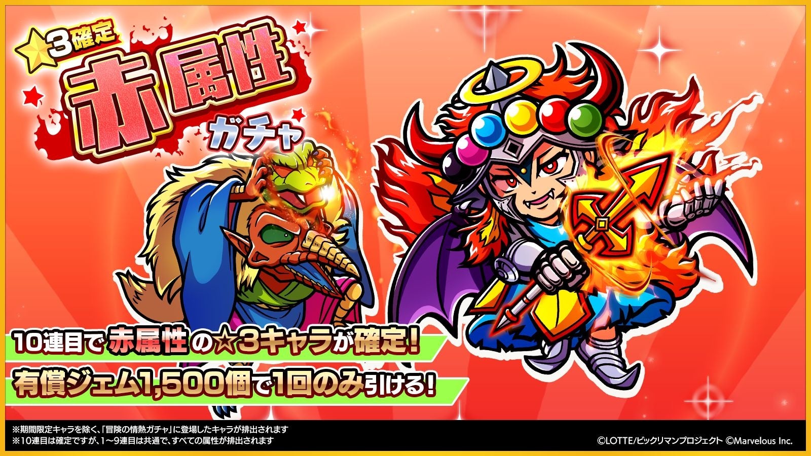1回限定で、有償ジェム1,500個で回せる「☆3確定 赤属性ガチャ」を開始いたしました。